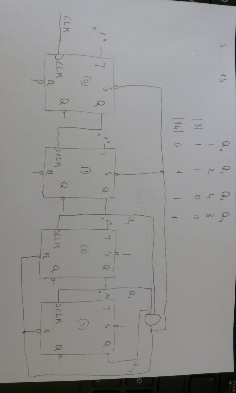 Egy elméleti kérdésem lenne (egyetemmel kapcsolatos)...Egy 4 bit-es aszinkron számláló és bármilyen logikai kapu felhasználásával kellene szerkesszek egy számlálót amely 3-tól számolna 13-ig és ezt folyamatosan ismételgetné. J K flip flop-ra gondoltam, csak nem tudom hogyan oldjam meg azt, hogy 3-tól kezdje a számlálást.