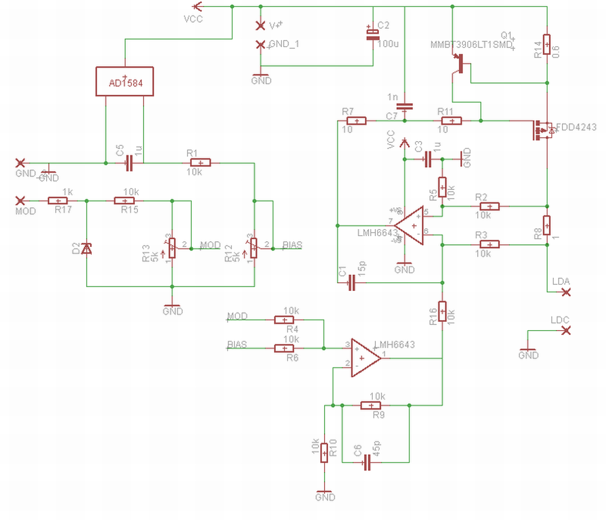 A rajz nem az én szellemi tulajdonom. Az áramkorlát az R14-vel állitható a Q1 Uec / R14 hányadossal. (kb 0.6V/ ellenállás) ami a megadott értékkel 1A. Az 1 ohm monitor nagyon pontos (<0.5%) és alacsony (<40-50) ppm értékű legyen. OPA-nak felhasználható pl az LT1013 is némi kompromisszummal. De jobb lenne egy high speed-,slew rate és rail-to rail erősitő.Befejeztem a lézerezgetést mire eljutottam volna odáig hogy leváltsam az lt1013-ast. FET-nek én irlib9343 -t vettem.