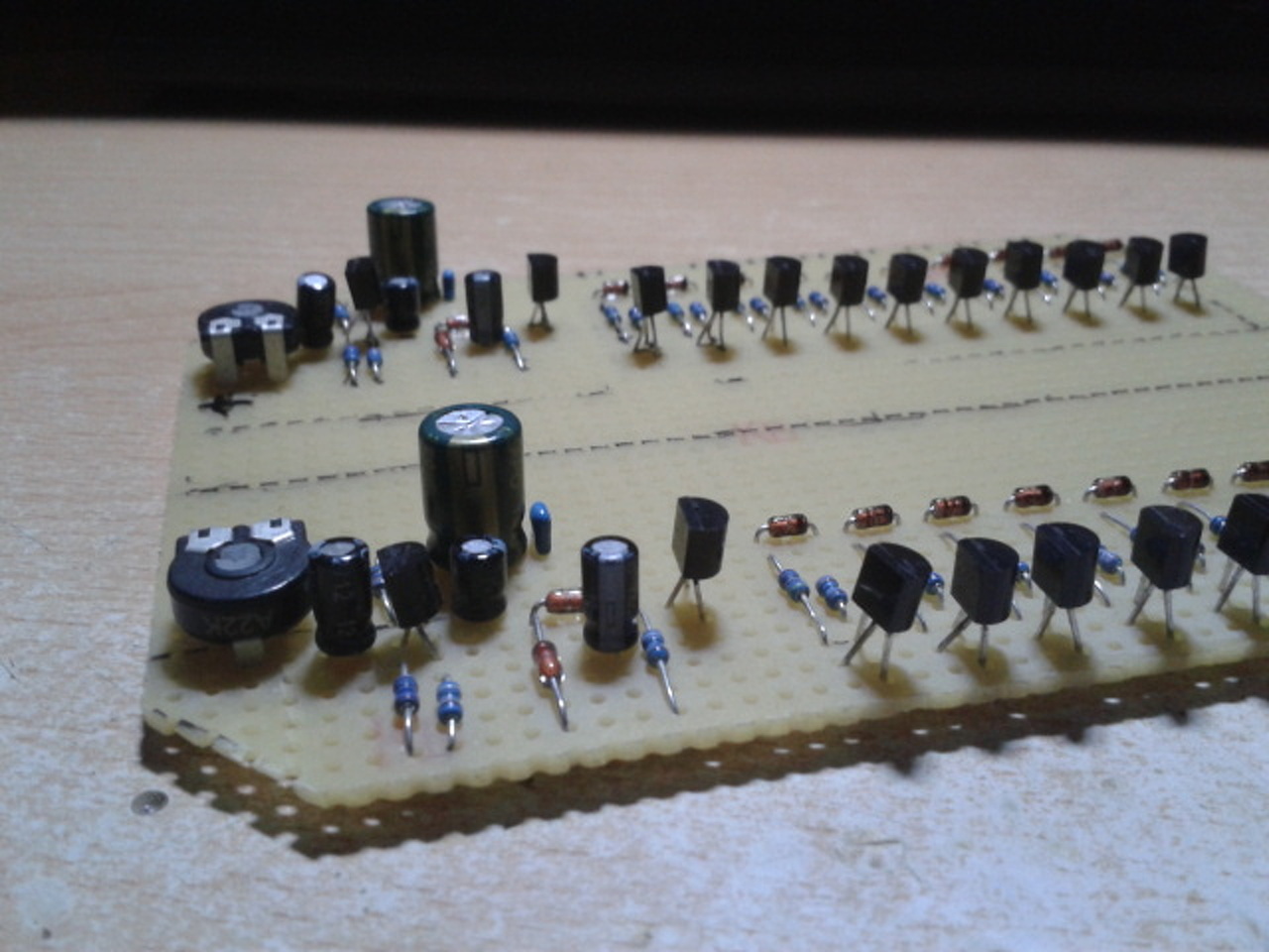 Azt hiszem, én is ezt a kapcsolást építettem meg, és a tranzisztor erősítése nem volt megfelelő, csak az első 5-6 LED világított. A tranzisztornál valamelyik ellenállást módosítottam, és azóta rendesen kivezérelhető. Hogy melyiket, arra már nem emlékszem.