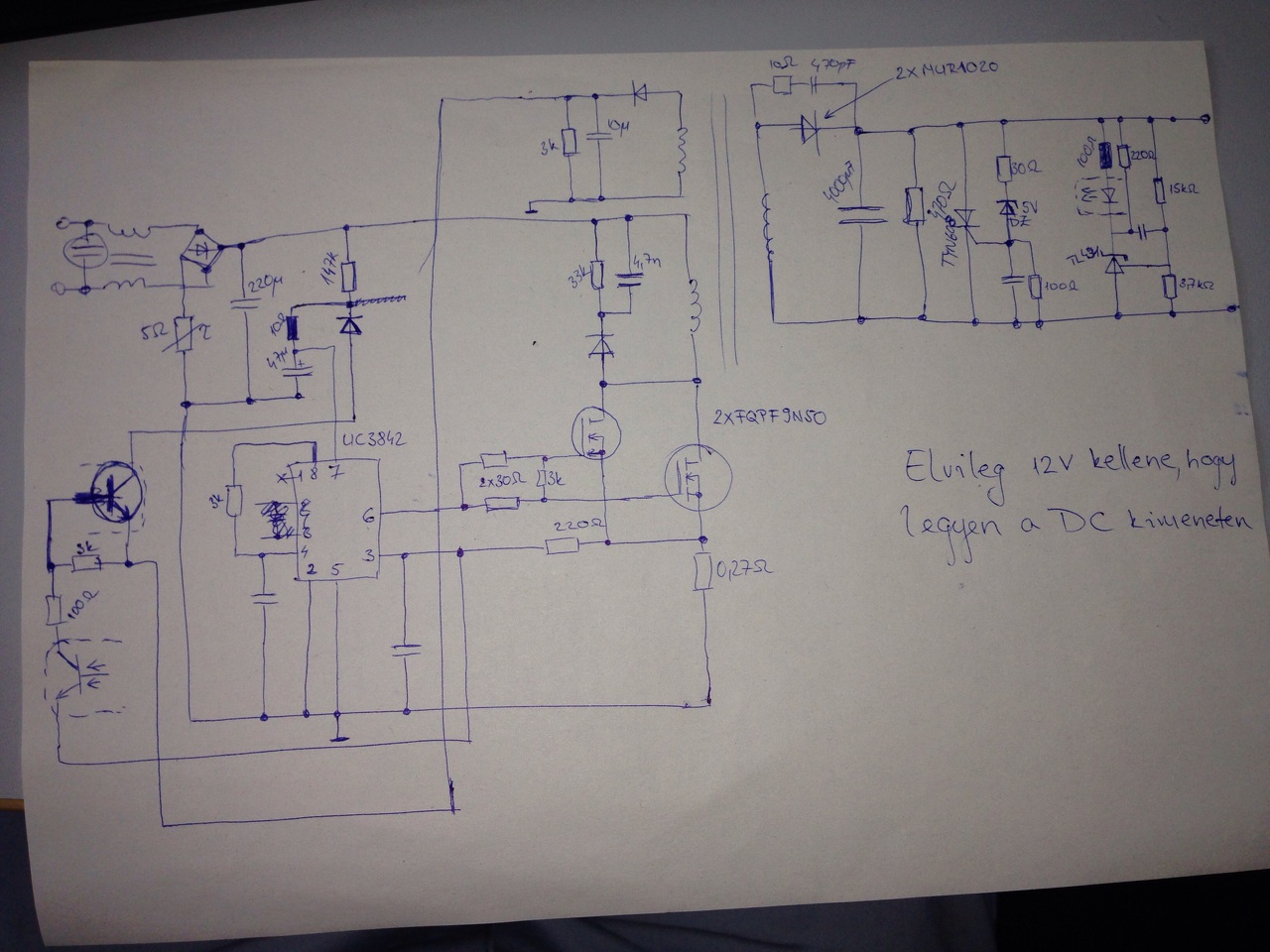 A mellékelt képen a FET-trafó környéke látszik a rajzon. Vezérlő IC: KA3843, áram-fesz. beállítás: LM358.
