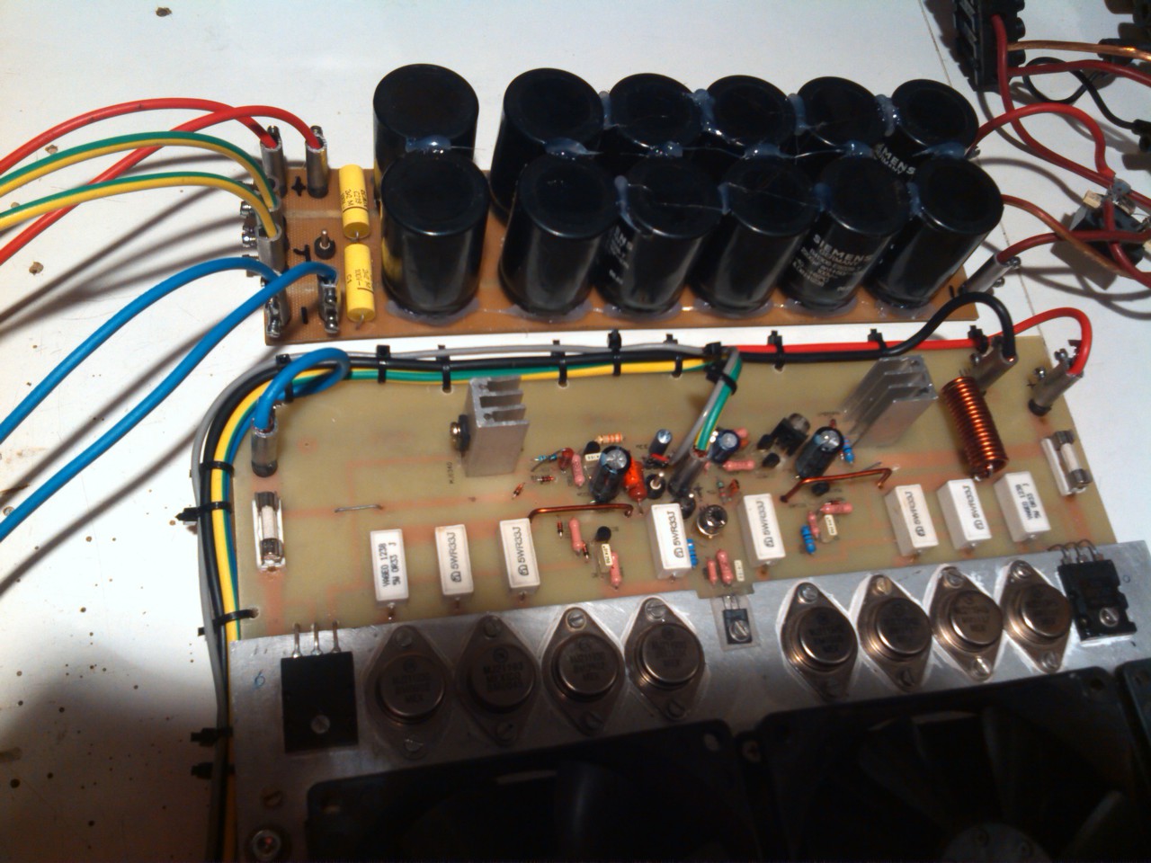 Hozzám került 1 végfok eléggé bele volt barmolva. Pár nap után megszólalt elég rendesen. Kérdéseim : -A végfok FET semmilyen korlátozó ellenállást nem tartalmaz gond-e ez. -Nincs hűtőcsillám teljes felületen fekszenek a FET-ek a borda adja a Közös pontot. Azt olvastam jobb ha szigetelve vannak a FET-ek, a borda test potenciálon, mert gerjedést okozhat a nagy hűtő felület. -Körülbelűl 20 centis toroidról, 2X70 Volt, 25A graetz híd, 4X10.000 kondi táplálja.