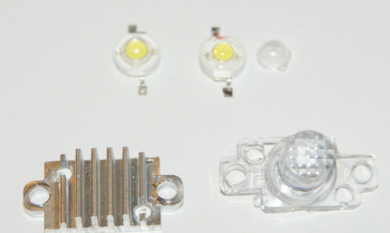 Tulajdonképpen inkább csak egy kis műanyag búra a leden, amit leszedegettem róla, a képen a két led mellett jobbra. Így ahogy próbálgatom, elég jónak tűnik a fénye és a kis hűtőborda is langyosodik, hosszabb járatás után is csak langyos marad, gondolom a 240mA miatt.