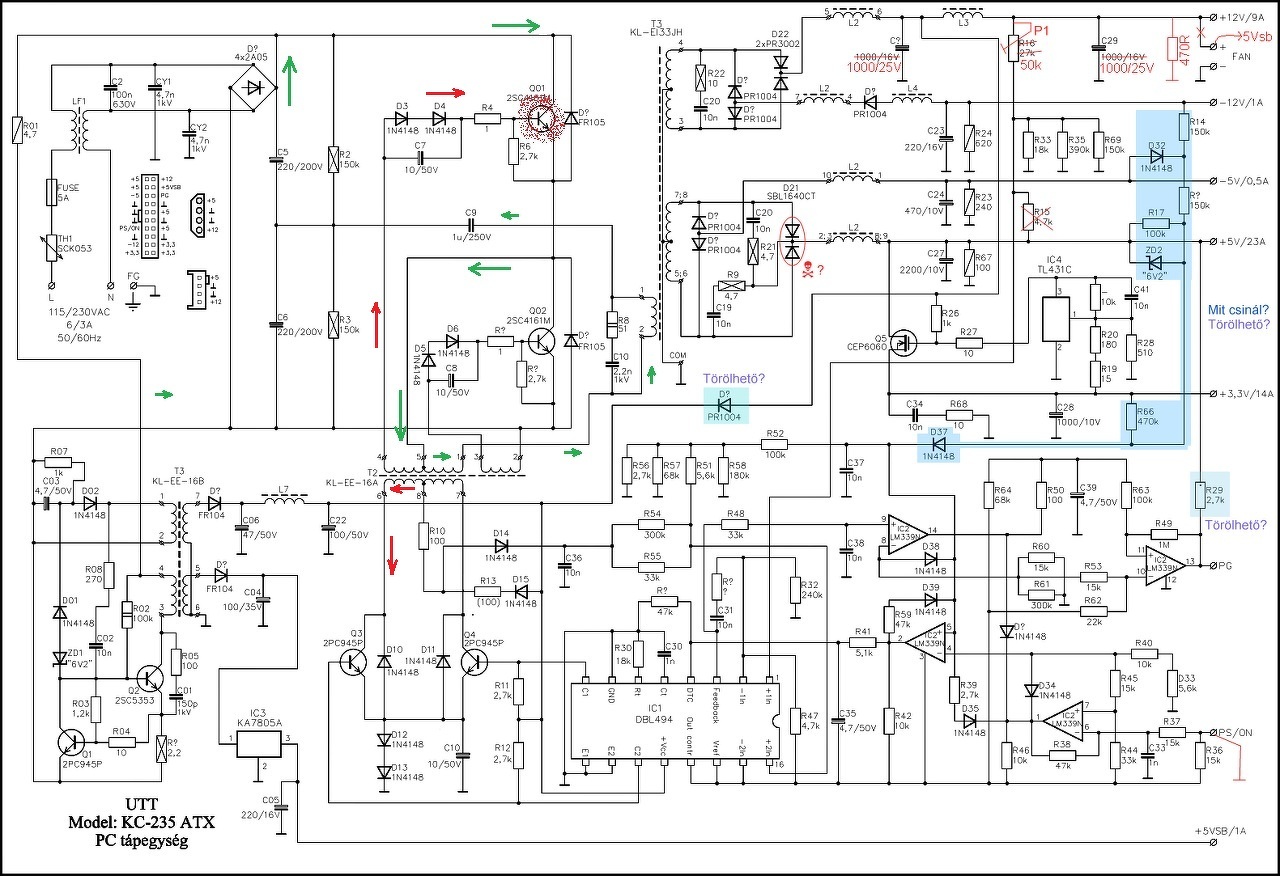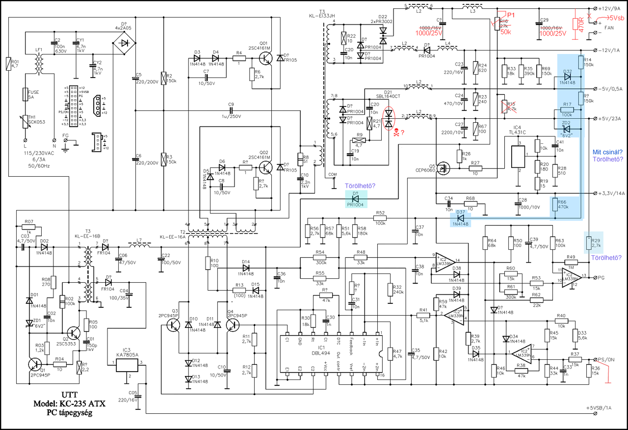 Idézet: ez nem igaz, mert ha elindul a táp, akkor a 4-es láb leesik 0,8 köré.„Az IC 4-es lába 1,22V -on van (mindig).” A P.G jelzés pedig nem is garantálja az összes tápfesz megfelelő szintjének meglétét. Ha a Feedback láb elért egy bizonyos feszültség szintet (átlag érték), akkor magasabb szintre kerül a 14-es láb, vagy valami ilyesmi. Szóval az egész LM339 kiírtható. A tipped: Idézet: pedig nem helytálló, mert az opamp nem néz rövidzárat, viszont a TL494 képes rá, és ki is van használva. (A vezérlő IC másik hibajel erősítője által, mint ahogy azt rendesen szokás, és mint már javasoltam itt valakinek...)„Sejtem, hogy a power good számolása mellett a túláram- és rövidzárvédelmet is ez végzi (mert a 494 olyat nem tud).” D? maradjon bent, a többit meg -szerintem- kiveheted ami el van kékítve. A pirosságok közül ne vedd ki R15 -öt , és akkor jó lesz a potenciométeres ötlet. Viszont nem érdemes az 5V SB -re kötni a FAN -t, és alaposan gondold át, hogy mi lesz a többi kimenettel, különös tekintettel azok puffer-kondenzátoraira! A hozzászólás módosítva: Dec 13, 2014