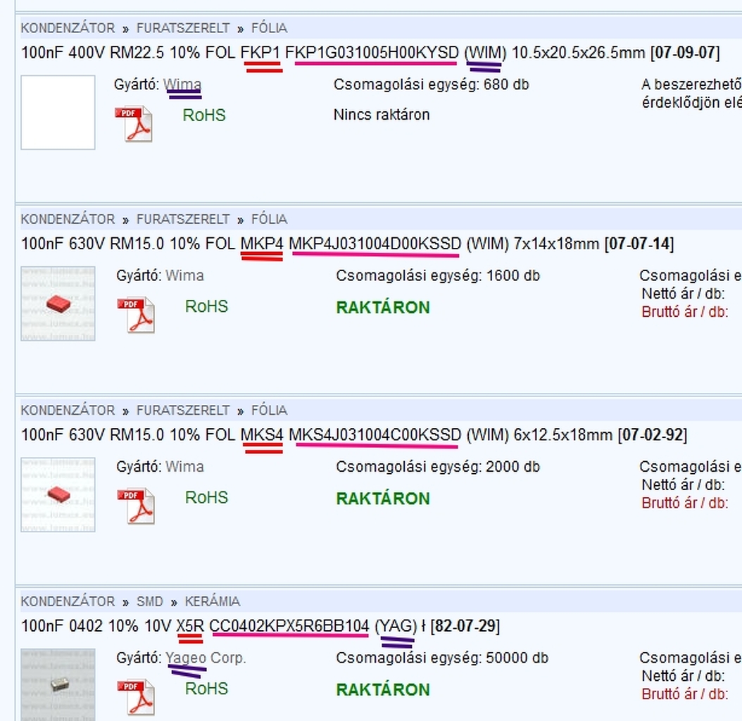 Ennyire nem kell túlbonyolítani mint ahogy a képen van, elég egy pontos típus (bordó aláhúzás), abból már ki tudja keresni a neten az adatlapot akinek szüksége van rá. Hasonló megfontolásból én kondit nem is nagyon vettem eddig máshol, mint a csatolt képhez tartozó webáruházból. És ezt mind jótanácsnak szánom, még ha másnak látszik is.