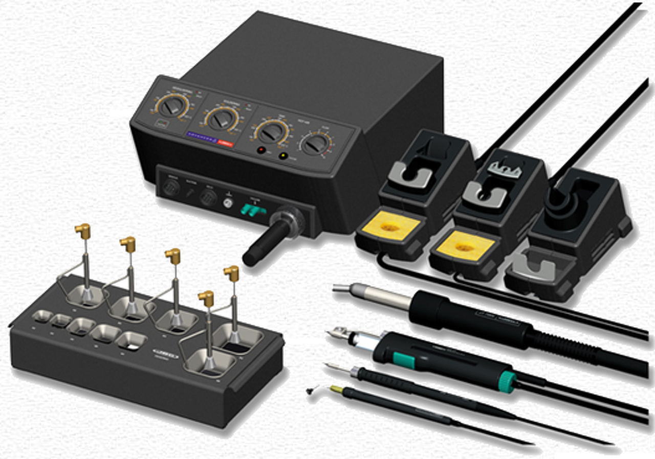 Na... Melóban ez a nagy kedvencem: JBC AM6000. (a Metcal MX-5000 mellett) Minden benne van, amire csak szüksége lehet az embernek: forrasztópáka, leszívópáka, hőlégfúvó (pedállal), vákuumpipetta, hővédő keretek kiemelőfejjel. Persze ez nem éppen a hobby kategória.