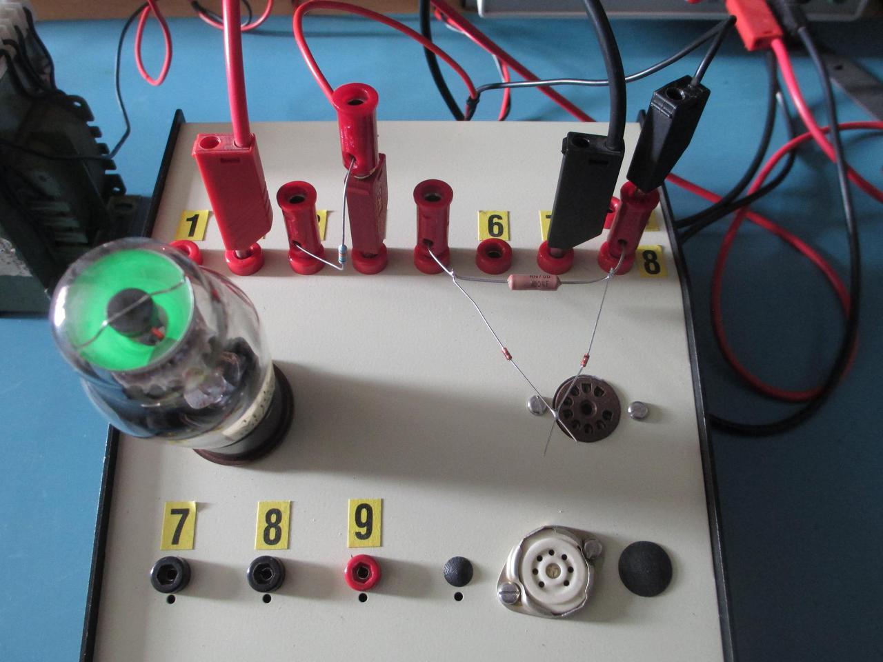 (Pl: adatlapon szereplő alapkapcsolás, vagy egy paramétert megmutató kis áramkört felépiteni.) Szóval fogtam magam,és egy selejt pultos műszerdoboz,és a 3 legnépszerűbb csőfoglalat,(Oktál, novál, miniatűr)és pár 4mm-es ,és 2mm-es laborcsatlakozó aljzat felhasználásával készítettem egy csőtesztelő"dobozt". A foglalatok kivezetéseit számozás szerint 1-1 4,és 2mm-es aljzatra kivezettem, ezen keresztül a tesztelendő cső felfűthető, betápolható,mérhető. A fotókon egy jenki varázsszem "tesztelése" látható. Hátha valaki kedvet kap egy hasonló dolog elkészítéséhez.