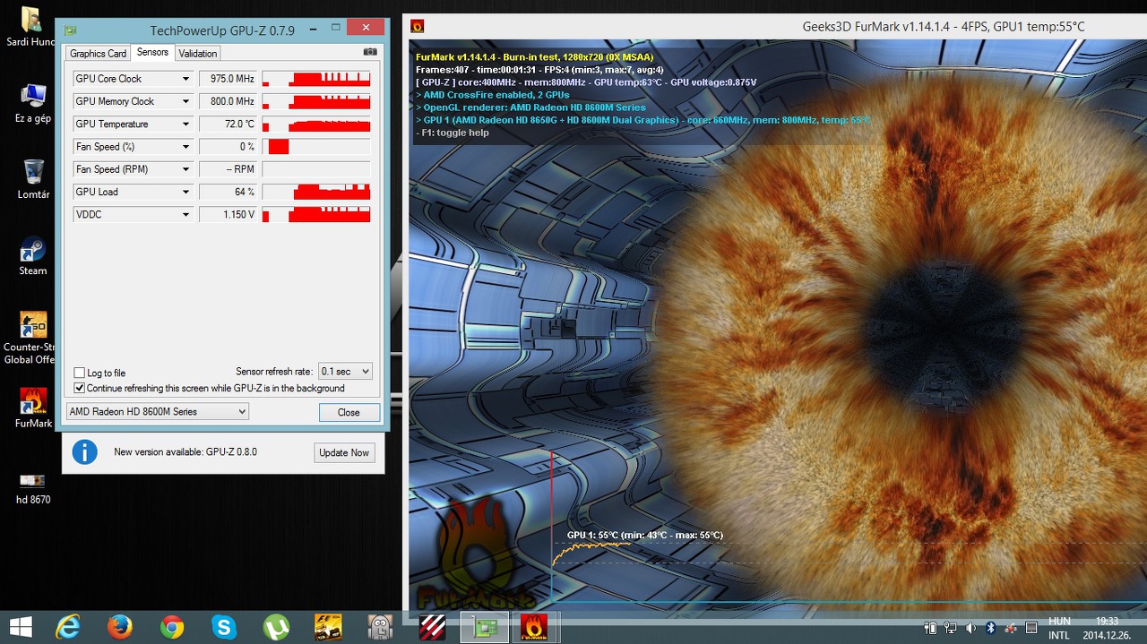 Ujabb kellemetlensegbe utkoztem. Az asus r510dp laptopomban dual graphics dolgozik ami all egy apu-ba epitett hd 8650 es plusz egy dedikalt 8670m videokartya parosbol crissfirex nodban. Az a gondom, hogy sajnos semmilyen 3d-s aplikacioban nem mukodnek maximum teljesitmenyen. A catalistban minden high performance-on van de sajna furmarkt alatt is csak fele orajeleken jar mintket gpu, sehogy nem tudom maxon jaratni. A legujabb driver van fent. Csatoltam kepet is. Amikor elindul a 3d-s alkalmazas par masodpercig megy csak maxon azutan lekapcsol fele orajelekre. Valakinek valami otlet, hpgyan birjam max teljesitmenyre. Sajnos igy a jatekaim sem mennek tul jol. Kerlek segitsetek!!!