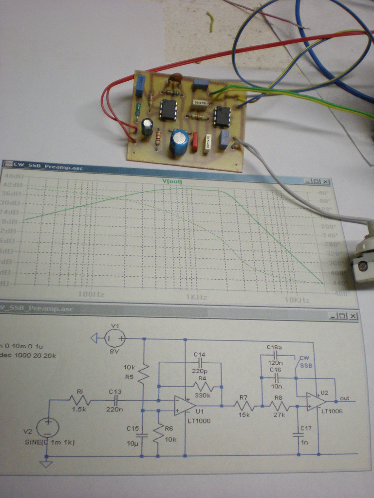Fojtattam a kísérleteket a kis vevővel.Építettem két 741-es műveleti erősítővel egy átkapcsolható CW/SSB szűrőt a HF fokozatba. Ennek az erősítése oly annyira növelte a HF fokozat erősítését, teljesen feltekert hangerőnél nem lehet megmaradni a műhelyben. Pedig csak az asztalra letett fejhallgató szólt. Sajnos a megnövekedett erősítés miatt fél hangerőnél elkezd gerjedni a végfokozat és őrült sípolásba kezd. Be is kellene állítanom még a jelszinteket. Viszont most már jó erős hangszórós vételt is lehetővé tesz a kis rádióm. Kár hogy annyira zajos a 80 méter. Most itt a HF részben fogok ügyködni, mert a frekvenciamérő hiánya miatt az RF fokozatban nem tudok dolgozni. Emiatt most minden RF dolgom áll (jelgenerátor, GDO, stb.). Most ezen a részen finomítgatok (ráfér). Még ennek a szűrőnek is be kell pontosítanom a vágási határait. Viszont érezhetően majdnem a helyén van, mert nem hallani (csak erősen elfojtva egy kicsit) AM adás. Egy két helyen a magas sávzajból morze jelek jönnek (inkább géptávíró) és egy helyen SSB is volt. Sajnos a magas zajszint miatt nem lehetett érteni belőle semmit. Sajnos a sávzajhoz hozzájön a rádióm elég magas alapzaja is, a következő napok feladata az, hogy ha a rádión nincs antenna akkor még teljesen feltekert hangerő mellett is csöndben maradjon (vagy legalább normális szintre csökkenjen a zaj).