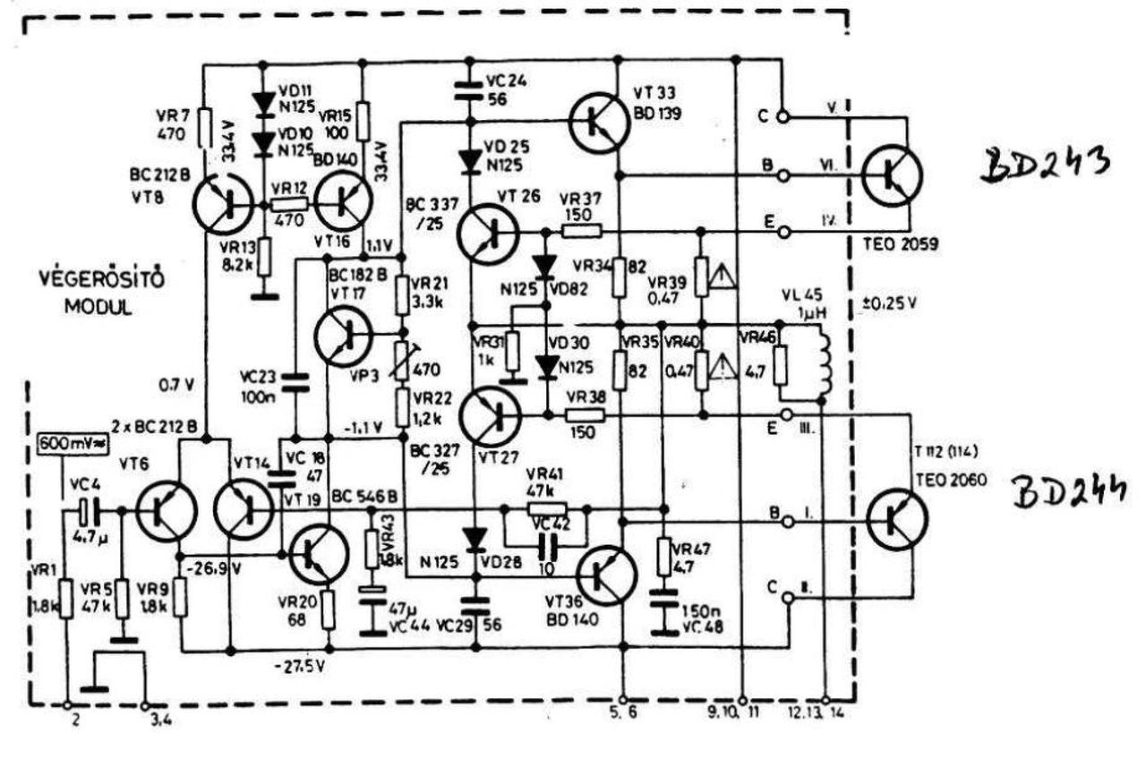 A VP 28 potméterrel az UT/2-öt állítjuk be, de a VT27 tranzisztor hűtőbordára kivezetésének van fontos szerepe. Ezt gyárilag nem oldották meg . Ezt kell utólag megoldani a nyugalmi áram stabilitása érdekében. Tehát az eredeti Texas kapcsolás az jó, csak a futószalagon a Videotonban a kivitelezés nem volt tökéletes.