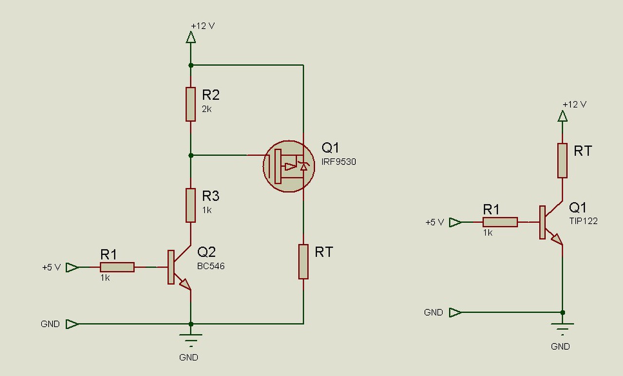 Ha mindenáron tranzisztorozni akarsz, én így csinálnám. Két lehetőség, a második kevesebb alkatrészt igényel igaz, ekkor a fogyasztó egyik ága mindig a +12 V-on van. RT jelenti a fogyasztót, jelen esetben a LED-eket.