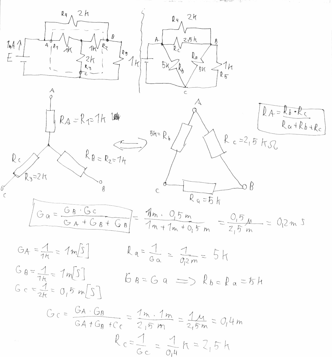 A csillag delta átalakítás nem olyan nehéz, a rajzon látszik. Matematikailag felírod melyik melyik ellenállás, a A pontba menő RA csillag esetében, meg delta esetében az Ra az A pontal szemközti (mert matekba úgye az az a oldala a háromszögnek). Utánna a keresett egyenlő a másik kettő szorzata per a mindhárom összege. Most még csak azt kell megjegyezni, hogy delta=> csillag akkor Rekkel (ellenállásokkal), még ha csillag => deltába akkor Gkel (vezetőképességekkel) kell számolni. Ha elektrosok vagytok, mivel nincs a tananyagban ajánlom a számológép tetejére felírni, valamelyik képletet, és mikor R, mikor G. Ez nekem is sokáig a számológépen volt, mellette a réz és az aluminium fajlagos ellenállásával. mindig jól jön ha kéznél van. Sajnos levettem Igen kiszámolható, Thevenin módszerrel is, de akkor feltételezned kell egy feszültségforrást, ami elégé kisérletezés alapon működik. Mivel csak az eredő áram ismert, ezért kellene először az eredő ellenállást kiszámolni, abból a feszültségforrást már egyszerű. Végeredménben mindegy, hogy hogyan számolsz; csak mint a matekban nem szabad elírni, elszámolni. Üdv. Tóbi Idézet: „Thevenin módszerrel is, de akkor feltételezned kell egy feszültségforrást, ami elégé kisérletezés alapon működik.” Nem kell konkrét érték! Egyszerűen azt írod, hogy U, és a végén kijön, hogy az mennyi.
