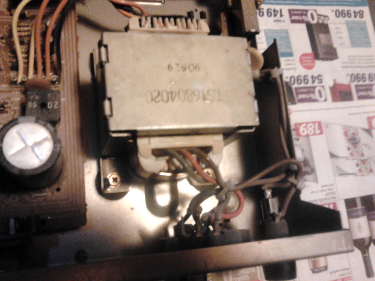 Minden lábát megjelölöd, hogy tudd hova, melyik. Kiforrasztod, kicsavarozod. A kis fémfüleket óvatosan kihajlítod, épp hogy kicsússzon a másik lemezből. Finoman lefejted a lemezborítást a vastestről. Ezután óvatosan lefejted a szigetelőréteget a tekercsről. Miután belelátsz, lehet, hogy meglátod a hőbiztit a tekercsrétegek közt. Ha ki bírod szedni a tekercsek sérülése nélkül, akkor hurrá, kicseréled. Ha nem látható, nem kiszedhető, akkor sajnos le kell a szekundert tekerni. Amit szintén jelölni, számolni. Alatta megtalálod a hőbiztit. Rövidre zárod (megszünteted), vagy az újat úgy teszed bele, hogyha meghibásodik, cserélhető legyen újabb szétszedés nélkül.