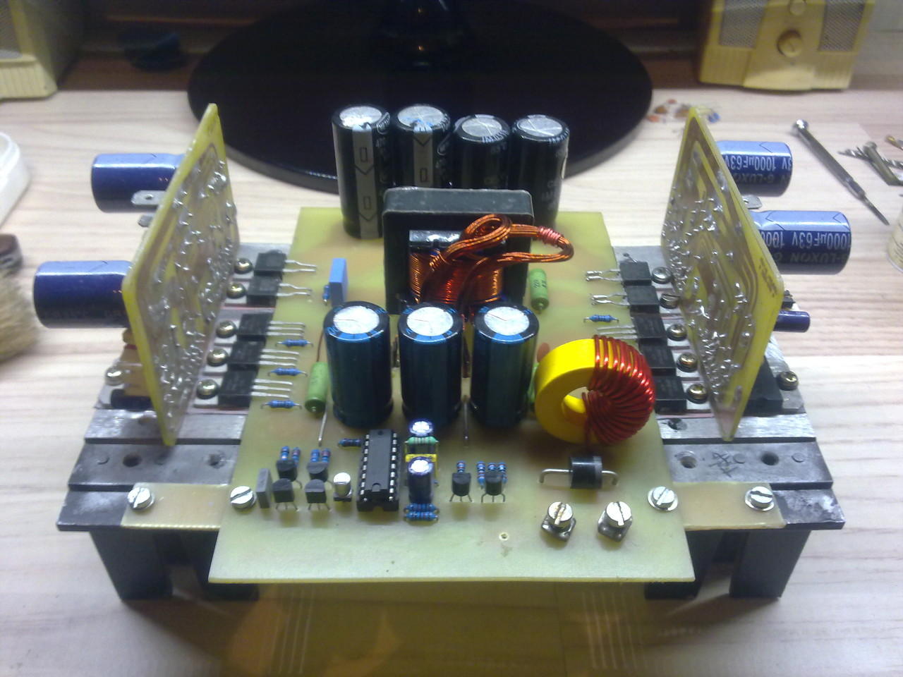 Haladtam kicsit megint az autóhifivel. Nemsokára megpróbálunk cikket is kovácsolni belőle ha beválik. (eddig 3 órát hallgattam aksiról de csak langyos lett a hűtőborda). Még a betáp oldali zavarszűrőt kell áttekerni és kész is.
