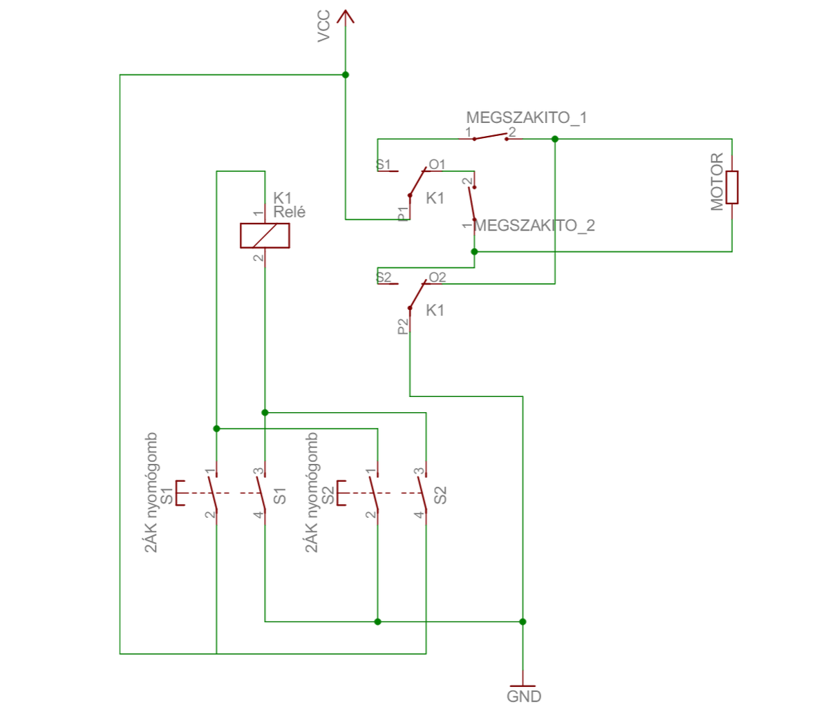 Két relével, keresztretesszel, stop bármely helyzetben.