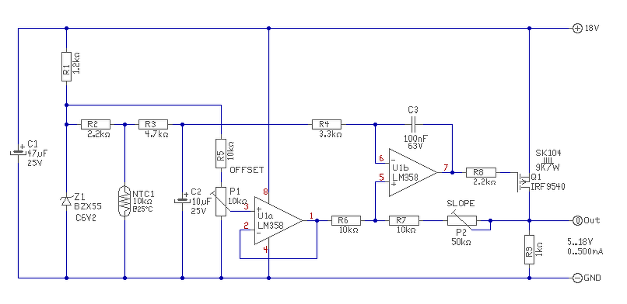 Megrajzoltam. Beállítani a következőképen célszerű.. - Elsőként a "Slope" meredekséget kell beállítani. Ezt a P1 trimmerrel lehet, mérve az LM358 1-es lábán a feszültséget a GND-ehz képest. A kívánt feszültség változás, dUki=18-5V=13V. Mivel a második fokozat erősítse fix 2-szeres, ennek felét kell beállítani. Vagy is 20..80 fok (vagy ennek megfelelő ellenállás) változásra, az IC 1-es lábán dU=6,5V feszültségváltozás legyen. (Nem feszültségnek, hanem változásnak! Pld. ez, mondjuk 4..10,5V-ot jelenthet.) - Majd az "Offset" eltolás potival, beállítjuk, hogy ez tényleg 5..18V között legyen a kimeneti feszültség változása. A beállítást, célszerű 80 fok (vagy ellenállás érték) mellett végezni, mert a 18V már "beleütközhet" a tápfeszültségbe, vagy is állítás közben nagyobb nem, csak kisebb lehet a tápnál a feszültség. Majd ellenőrizni a tényleges tartományt.