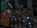 Szinte az összes elkó *, még jó, hogy csak 18 darab van a két végfokpanelen. Kicseréltem őket, de mérem folyamatosan a nyugalmi áramot és a jobb oldal 30mA-ről 10perc után 85mA lett, langyoskás borda. Bal oldal 30mA 10perc múlva 35lett. Állítottam kicsit, és akkor már szépen kúszott felfelé kb olyan ütemben mint a másik oldal, és kb ugyan úgy melegedett. Egyenlőre így marad, majd kiderül lesz e még gond. Ellenállások jók voltak bár nem sokat forrasztottam ki, többit helyben mértem.