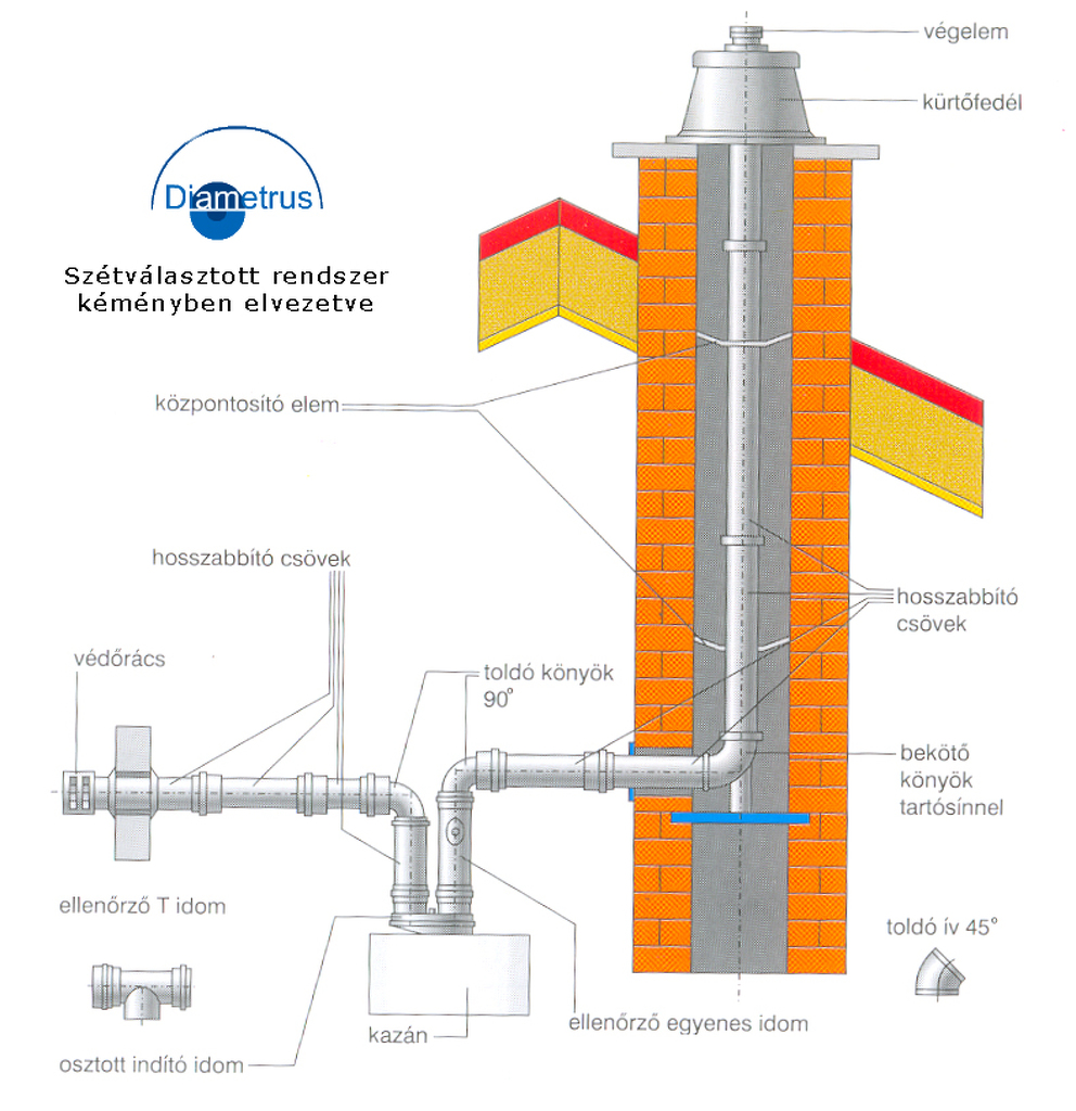 "A középső csőben, amely anyaga lehet speciális minőségű műanyag is,vezetik az égésterméket, a külső csődben vagy más alakú csatornában pedig ezzel szemben az égéshez szükséges levegőt."