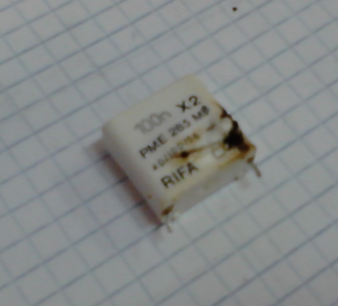 Amikor kicsomagoltam vettem észre, hogy a fojtótrafó utáni [C2] (mert előtte is van egy ugyan ilyen) X2-es 100nF-os kondi kidurrant (valamikor régen), és az oldalán kifújta a 'beleit' a környező alkatrészekre.