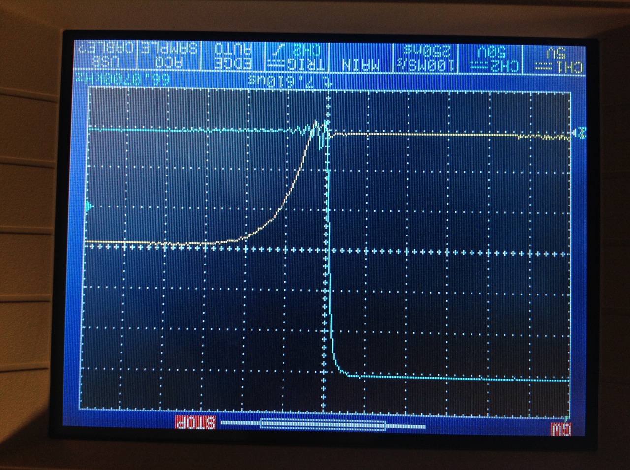 Na de most készítettem képet a 24 menetes primerrel, 400W terheléssel. Ch1 - FET UGS Ch2 - FET UDS Az alsó feten mérve. Valamint még a két utolsó képen a szinuszos áramot 1 ohm ellenálláson mértem a primerrel sorosan. Tehát 5V per osztás = 5A. Idézet: „De 12 primer menet esetén a FET melegszik, akkor gondolom ott van a veszteség.” Az oké, de rá kellene jönni, hogy miért, milyen egyéb hibát vétettél. Kicsit - nagyon idegesítő, hogy a szkóp fejjel lefelé van. Az azonban látszik, hogy a működés ZVS, hiszen a FET kikapcsolása után rögtön kezd felszáguldani a DS fesz, és a FET bekapcsolása előtt már leszáguld. A FET bekapcsolása előtti negatív tüske is látszik. A belengések a nagy parazita induktivitásokra utalnak. (vagy a később említett túl gyors félhídátmenet miatt) 5V per osztás, vagyis 36A pp van??? A primeren? Biztos? Biztos nem rontasz el valamit oltárira? Mert ha te félhidat használsz, és látszik 300Vpp a trafón, tehát 150V van a trafón, és a trafódon kb 10A eff folyik, az 1,5kW... Biztos nem az van, amit voodoo mond, és atomra elszámoltad magad? Mennyi most a mágnesező és szórt induktivitásod? Az is gyanúgy, hogy a félhídátmenet jó <50ns (ki kellene nagyítani), ez egyrészt túl gyors, vagy a hotlidő ehhez túl sok. Amúgy az áramgörbe alapján közel a rezonanciafrekvencián vagy. A hozzászólás módosítva: Jan 21, 2015