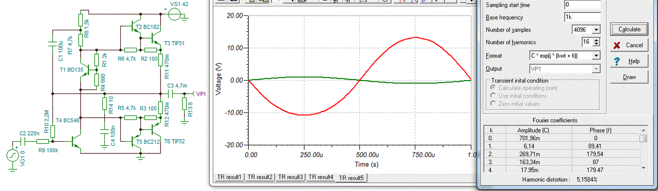 A Clipboard02 -es rajzot szimuláltam én is. Szimuláld le 8kHz -en és meg fogsz lepődni. Néhány probléma: - a nyugalmi áram nem állítható, jelenlegi beállításban 1,4 Amper - nem hőkompenzált a kapcsolás - nincs rövidzárvédelem - A T3 -as végtranzisztornak nagyobb kivezérlésnél elfogy a vezérlő árama, az R8 -on keresztül nem kap elég áramot (csatolva) - kevés a kapcsolás érzékenysége, még a másfél voltos jel sem hajtja (hajtaná) ki. Ez egy "mezei" visszacsatolt kapcsolás, nem is a jobbak közül, Te nem ezen az úton szoktál járni, nem ilyen kapcsolásokat szoktál tesztelgetni. |