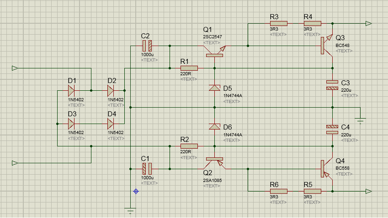 Így? a Trafónak nincs közép kivezetése. Az a baj h nincs is olyan trafóm itthon, ezért szeretnék egy virtuális +,-, gnd-s tápot csinálni.