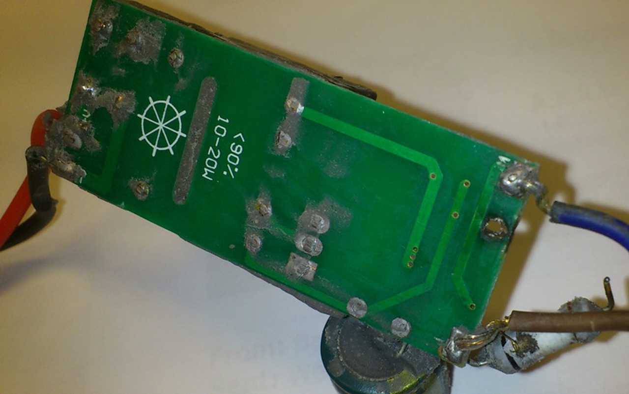 Ez egy led "reflektor" tápegysége (volt). Szerintetek milyen értékű az elszállt ellenállás, és hová tudnám visszaforrasztani? Az M7-es SMD kis lába is lóg a levegőben.