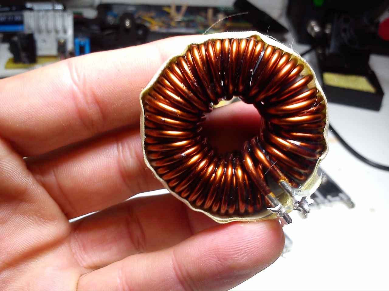A tekercset én úgy szoktam elkészíteni, ahogy a fotókon látható egy ferritgyűrűre két tekercset szemben egymással, menet menet mellé. Csodákra képes..