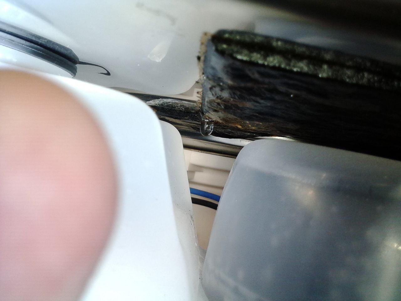 Gyanakodtam én rá, hogy lyukas és igazam lett. Levakartam vagy 5 négyzetcm nyi ragacsot. Hát nem ott spriccelt a víz. Mikor rezgett a gép a kartól akkor ütemesen jött a víz. Gondolom egy gondos késbehelyezés volt mostanában. El is beszélgetek a babámmal.