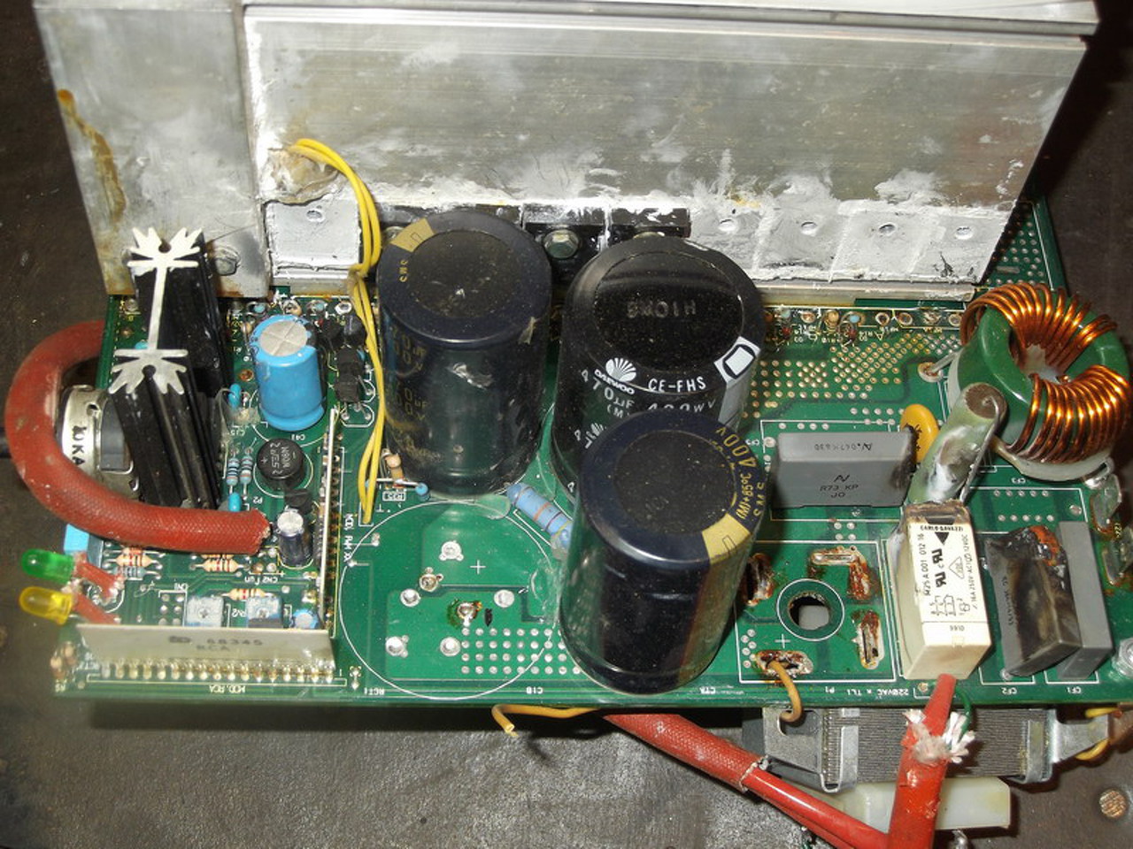 Kapcsolási rajzom sajnos nincs,de talán első körben nézd át a magasfesz diódahidat,pufferkondikat.Ezek körül kéne hogy legyen kb. 5-7W-os ellenállás,annak értékét ellenőrözd.A meghajtó fetek(igbt-k),a körülöttük lévő diódák,zénerek állapotát nézd át. Milyen jelzésű IC-k vannak a gépben?Azok is tudnak árulkodni(hogy körülöttük esetleg mit lehetne még átnézni).