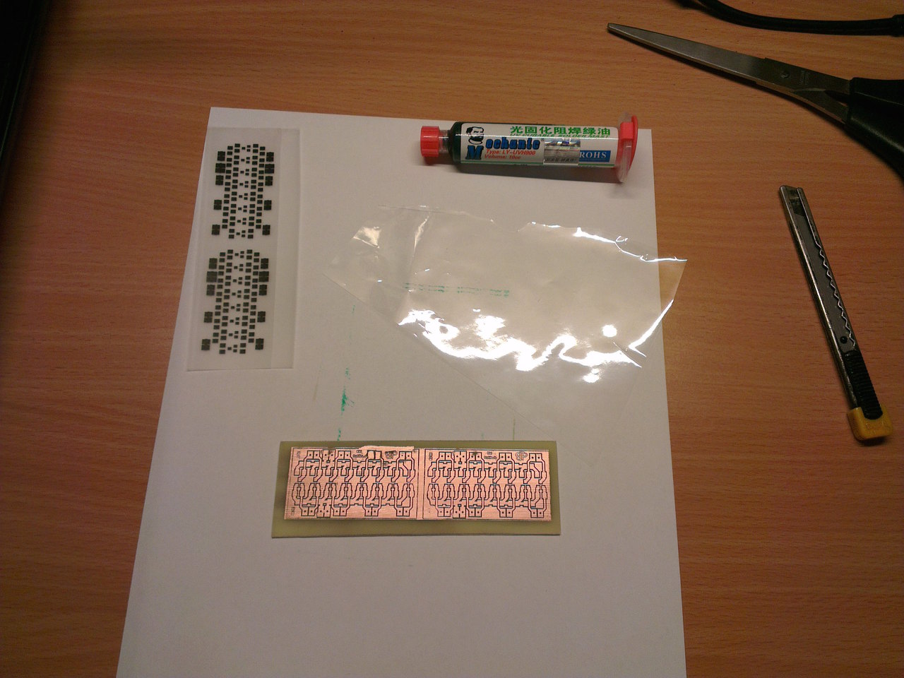 Csatolom a képeket a végeredményről és persze megosztom a tapasztalataimat. Az elkészítés a következő módon történik. Nekem POLIMAT LASER 090MY fóliám van itthon, tök véletlen leltem rá az irodaszerek közt a szekrényben. (hogy honnan és mikor jött azt nem tudom, de hála istennek van vagy 30ív , annyi azért hozzátartozik, hogy matt fehér, áttetsző)Nos a nyákot elkészítettem először vasalással majd a kész nyákra nagyon kevés kis UV pasztát helyeztem el a felső részére, majd egy vékony (nem celofán) virágok csomagolására használt fólia darabot helyeztem - fontos, hogy ne legyen gyűrött - a nyákra. Egy plasztik kártya segítségével szépen egyenletesen vagy is törekedtem az egyenletes elosztásra, elhúztam. Ezután a fóliát amelyre rányomtattam a 2db egyforma mask filmet, felvágtam és fedésbe összeillesztettem majd egy pici pillanatragasztóval rögzítettem felül és alul is. Ezt a mask filmet ráhelyeztem a nyákra és pontosan beállítottam a szükséges fedéseket, majd pici kapton szalagcsíkkal rögzítettem a vékony kis fóliához. ( ami közvetlen érintkezik a pasztával ) Itt érdemes megjegyezni, hogy a mask filmet érdemes picivel nagyobbra vágni mint a nyák hasznos széle, hogy a kapton szalag ne takarja ki az esetleges még szükséges UV pasztával bevont területeket. Továbbá érdemes a vékony fóliát is jóval nagyobbra vágni mint a nyák és a mask film mert ehhez fogjuk majd ideglenesen rögzíteni a mask filmet. Ezután behelyeztem a levilágítóba és egy fehér sima A4-es lapot helyeztem fölé, hogy minél jobban visszaverje az UV fényt. 20perces levilágítás után kivettem és egy finom papírtörlővel vagy fültisztító pálcával letisztogattam a felesleges pasztát itt lehet használni valami alkoholos tisztítót is vigyázva a szükséges rétegekre, nehogy azt is lemossuk. Ez után visszatettem a levilágítóba és még 1óra levilágítással keményre szilárdul a paszta. Ennyi a dolog A hozzászólás módosítva: Jan 29, 2015