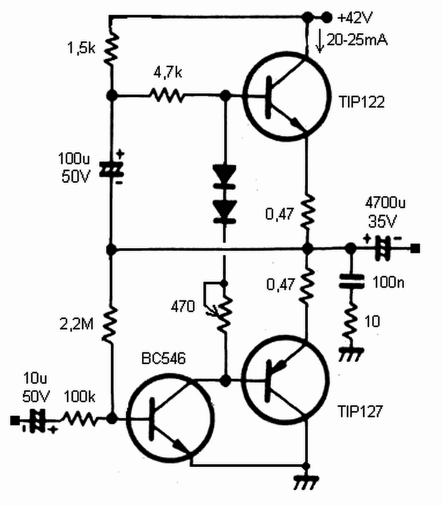 Szia! Sima alapkapcsolás, itt a klasszikusnak számító változata. Kicsit torzít, kicsit DC labilis. Ami hiányzik belőle azt megtalálod a HTA-30-ban. A bemeneti 10µF csatoló értéke majd két nagyságrenddel mellészaladt.