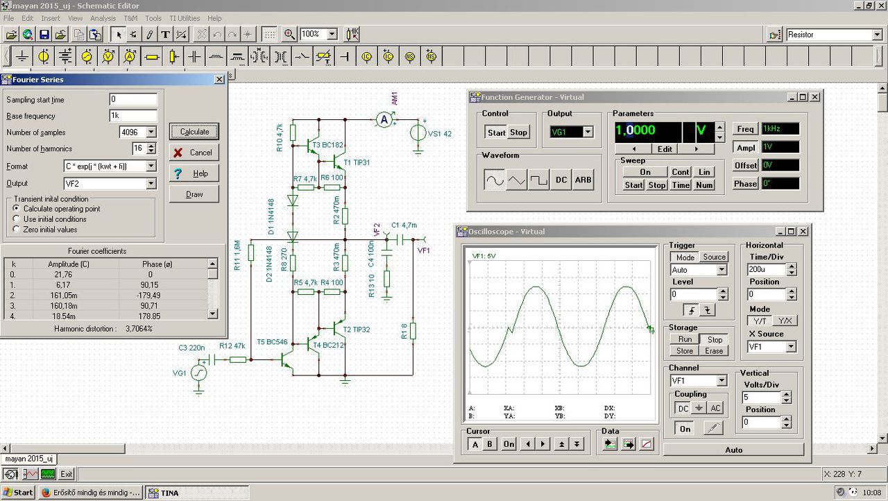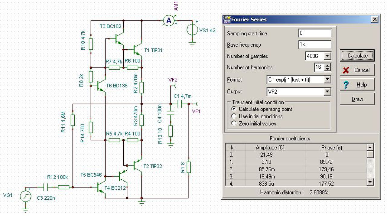 A Clipboard02 -es rajzot szimuláltam én is. Szimuláld le 8kHz -en és meg fogsz lepődni. Néhány probléma: - a nyugalmi áram nem állítható, jelenlegi beállításban 1,4 Amper - nem hőkompenzált a kapcsolás - nincs rövidzárvédelem - A T3 -as végtranzisztornak nagyobb kivezérlésnél elfogy a vezérlő árama, az R8 -on keresztül nem kap elég áramot (csatolva) - kevés a kapcsolás érzékenysége, még a másfél voltos jel sem hajtja (hajtaná) ki. Ez egy "mezei" visszacsatolt kapcsolás, nem is a jobbak közül, Te nem ezen az úton szoktál járni, nem ilyen kapcsolásokat szoktál tesztelgetni. |