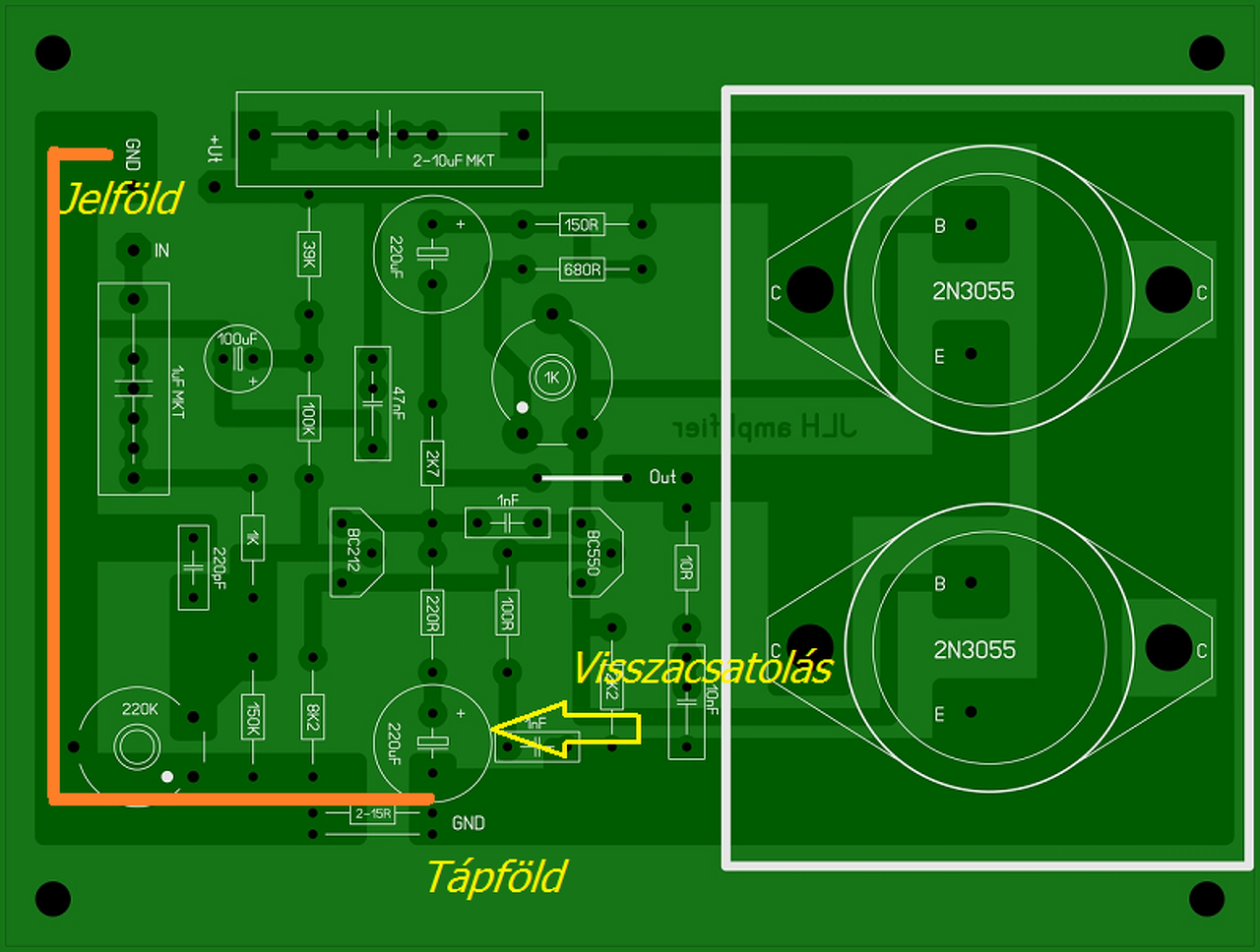 Az alábbi képen narancs színnel jelölt vonal a bemenet és a visszacsatolás közötti vezetősáv. Ha ezen vezeted a tápáramot, a rajta eső feszültség tartalmazni fogja azt a hullámosságot ami a tápszűrés után még megmarad. Mondanom sem kell, ha úgy huzaloztad ahogy feltételezem, ez simán hozzáadódik a bemenő jelhez. Az már a rajz készítőjének róható fel, hogy a kezdők számára nem írt kommentárt a GND pontok mellé.