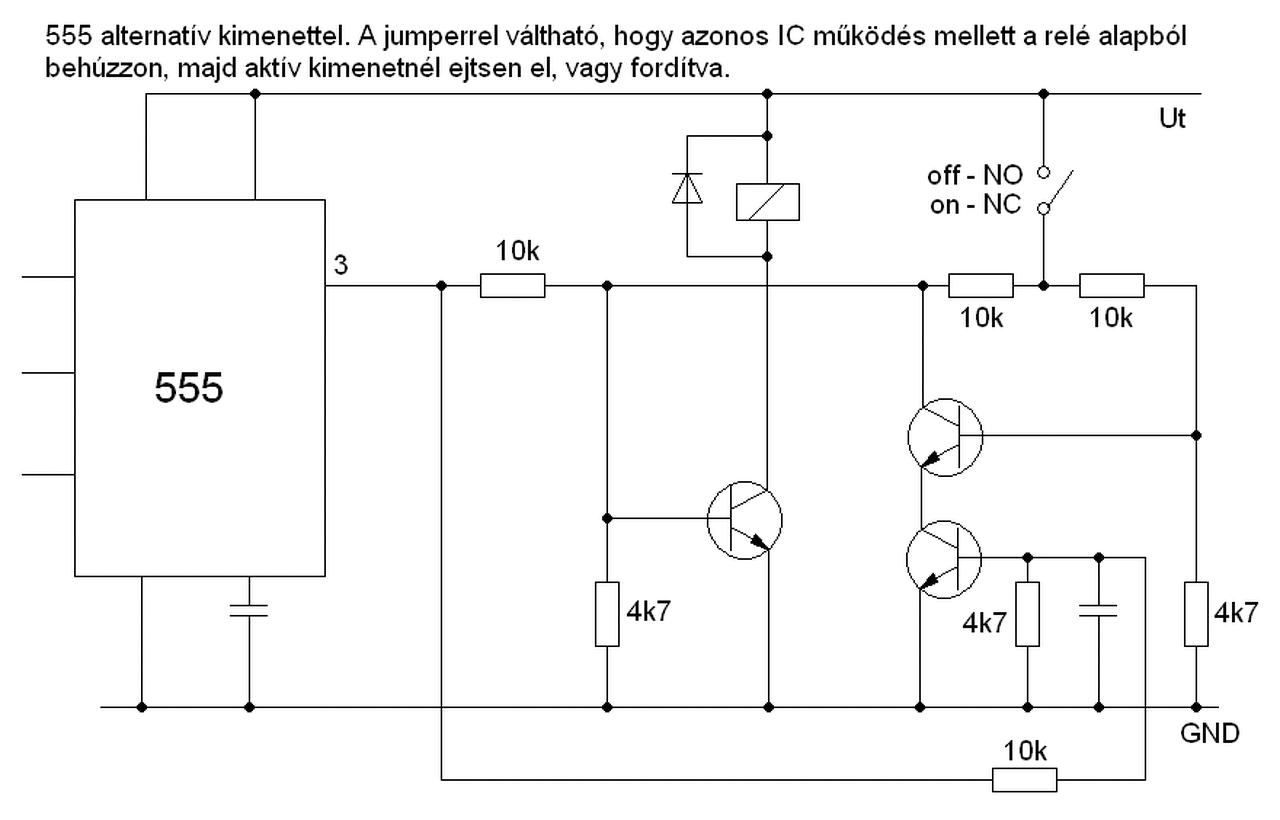 Remélem még nem volt. Nemrég meggyűlt a bajom egy kaputelefont elektromos zárhoz illesztő modullal. Sima 555 monostabil, relé kimenettel. Az idő állítható, ezzel volt a baj, a legkisebb időre volt állítva alapból, ezzel a beállítással nem történt meg a zár nyitása. De mire rájöttem visszarajzoltam és a kimenetet egy kicsit érdekesnek találtam. A relé egy záró kontaktussal szerelt volt, ezért egy furmányos megoldással egy jumperrel váltható a kimenet típusa.
