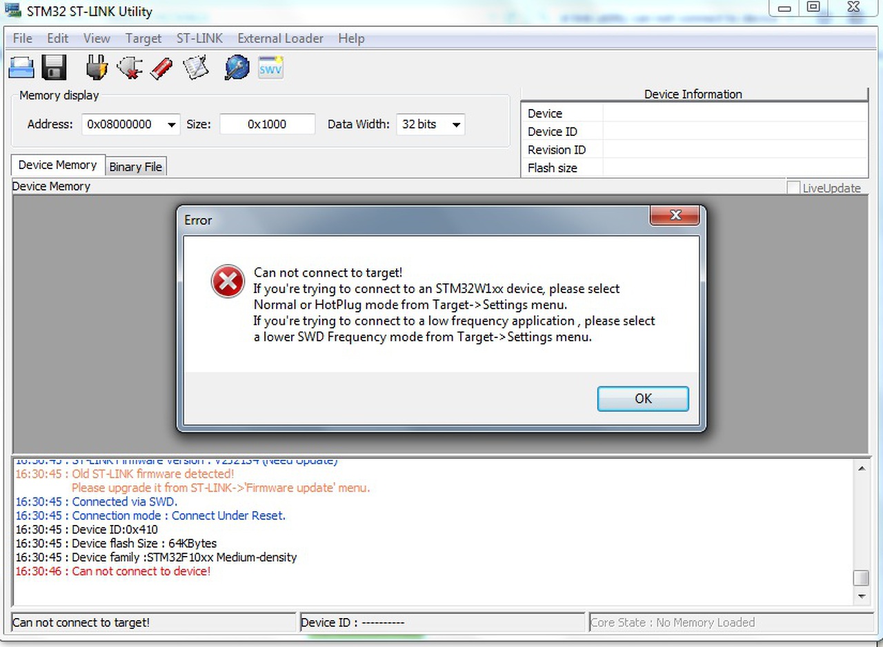 Az STM32 stlink utility beolvassa a memória méretet, a chip típusát de "can not connect to device" hibát kapok. Miért? (első kép)