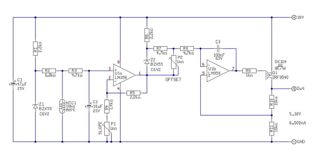 Megrajzoltam. Beállítani a következőképen célszerű.. - Elsőként a "Slope" meredekséget kell beállítani. Ezt a P1 trimmerrel lehet, mérve az LM358 1-es lábán a feszültséget a GND-ehz képest. A kívánt feszültség változás, dUki=18-5V=13V. Mivel a második fokozat erősítse fix 2-szeres, ennek felét kell beállítani. Vagy is 20..80 fok (vagy ennek megfelelő ellenállás) változásra, az IC 1-es lábán dU=6,5V feszültségváltozás legyen. (Nem feszültségnek, hanem változásnak! Pld. ez, mondjuk 4..10,5V-ot jelenthet.) - Majd az "Offset" eltolás potival, beállítjuk, hogy ez tényleg 5..18V között legyen a kimeneti feszültség változása. A beállítást, célszerű 80 fok (vagy ellenállás érték) mellett végezni, mert a 18V már "beleütközhet" a tápfeszültségbe, vagy is állítás közben nagyobb nem, csak kisebb lehet a tápnál a feszültség. Majd ellenőrizni a tényleges tartományt.