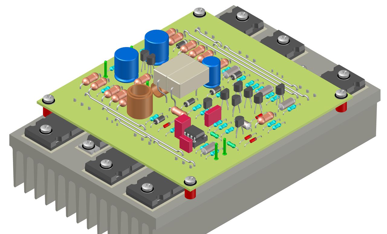 Sőt tovább is gondoltam egy kicsit, és ha a panelt nagyobbra hagyjuk, kiengedjük a tokozás széléig, akkor azon is kifúrhatjuk a szükséges rögzítő lyukakat, és ezen keresztül is lefogathatjuk a hűtendő félvezetőket. Ezek a lyukak egyből pozíciót is adnak, sőt még egy köztes szigetelő lapot is használva, egyfajta bilincsként is felfoghatóak. Ezt már nem rajzoltam le, de elsőre jó ötletnek tűnik. Az egyetlen TO220-as tokozású tranzisztorban van egy kis csavar, mert annak magassága eltérő, de ez is megoldható egy alakos betéttel.