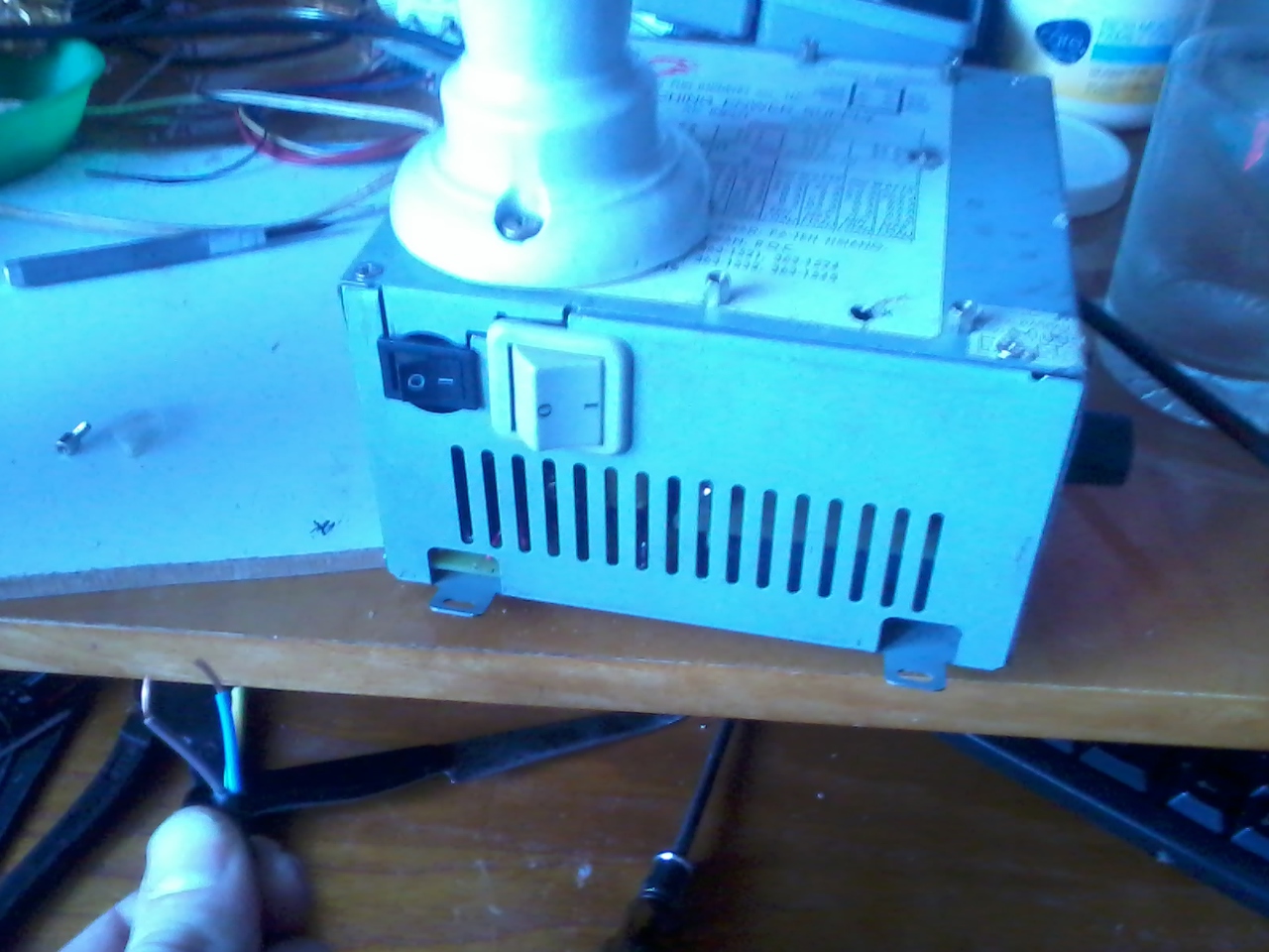 Azt hiszem felvállalható a forrasztó állomásom műszaki értelemben vett végleges formája. Mostanában sokszor volt szükségem hálózati feszültséggel sorba kötött izzóra. Gondoltam nem szenvedek a vezetékekkel, és egy fokkal biztonságosabb formában elkészítem kompakt kivitelben. Hát ez lett a vége, a kis kiegészítés függetlenül működik a forrasztó állomástól, a kimeneteit 2 áramkörös kapcsoló szakítja meg. Így elkerülve, hogy "kikapcsolt" állapotban fázis kerüljön valamelyik vezetékre a "kimeneten". A fehér kapcsoló bekapcsolása után ha rövidre zárom a kimenetet az izzó világit. A fekete kapcsoló rövidre zárja az izzó 2 "lábát" így lehet tesztelni vele, nem kell vadászni konnektort. Hiányzik még a "kimenetről" a csatlakozók, de oda még nem tudom mit fogok használni.