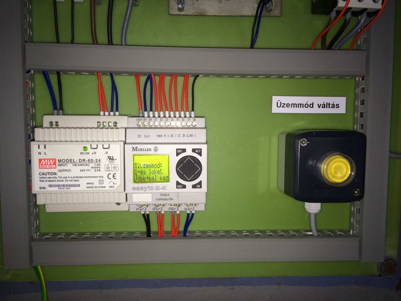 Az elmúlt héten egy 100t nyomóerős présgépet újítottam fel. A régi elavult relés vezérlést cseréltem ki moeller programozható relére. A megrendelő kérésére kapott üzemmód váltási lehetőséget is. 5 különböző üzemmód található a gépen, melynek visszajelzése a programozható relé kijelzőjén olvasható. Régi alkatrészként a szekrényt, illetve a 230/24V-os trafót használtam fel a munkalámpához.