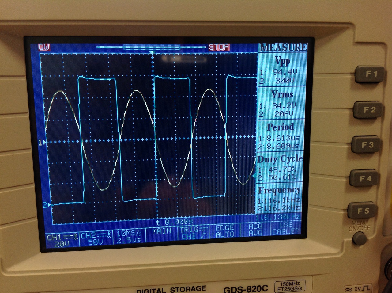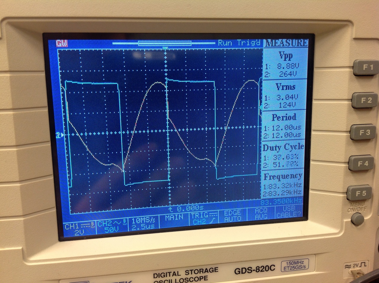 A hatásfok az eddigi műszerezés szerint 89%, viszont most már a vasmag furcsa hangokat ad ki, és a szinuszos áram formája sem az, hanem megdűl kicsit. Mint ha telítődne a vasmag mert a fetek kezdtek el melegedni. A réz már kézzel megfogható maradt, viszont sovány keresztmetszet mellet megy. Ezért úgy gondolom növelem 13/6 arányra. Lementem már 60 kHz környékére is. Ott sem volt jelentős javulás. Küldök fel egy szkóp képet, meg azt, hogy néz ki. Az áramváltó pontosan 10 A - 10 V / osztással van 75 ohmra 75 menettel készítve, mert így pont jó, 4 W ellenállással. Nem melegszik. 10 A primer áram esetén 1.3 W disszipálódik el rajta. Szóval most annyi áramot mutat a szkóp amennyi a feszültség az ellenálláson. Sőt azt is megmértem, hogy a 75 Ohm valójában 78 Ohm és ennek megfelelően 78 menetet tettem az áramváltóba. Jah, kivettem a légrést, mert akkor nagyon torzult a szinusz. A képen már a légrés nélkül megy. A hozzászólás módosítva: Feb 4, 2015
