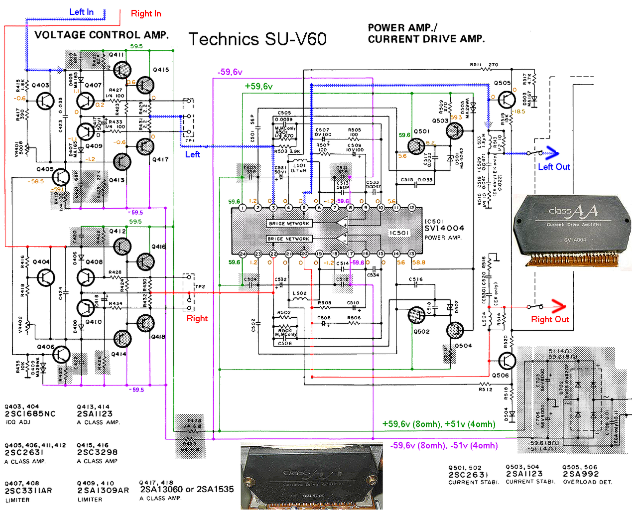 Sziasztok. Van egy Technics SU-X880 tipusu erositom, hibasan, potom aron vettem mert kellett a bekapcsolo gomb egy masik erositobe. Remenykedtem, hogy talan sikerul eletet lehelni bele, mert van egy-ket ritka es draga alkatresz benne (AN7062n, SVI4004). Elso korben a kovetkezo hibas alkatreszeket mertem ki: a +-12V-os stabilizator 10R bemeno ellenallasai megszakadva; a v.amp-ban Q516 C-E zarlat es persze R554 6R8 megszakadva, ugyanugy R511 47R - ezen keresztul kapja az AN7062 a + tapfeszt. Ezen alkatreszek csereje utan bekapcsolaskor Q703 (-12v stab) pillanatok alatt forro, ugyanugy az AN7062 is. Az ic labai kozott nincs rovidzar, megis bekapcsolaskor nagyon nagy a fogyasztasa. Jo eselyem van arra, hogy tonkrement az ic, igaz? Nagy kar, mert enelkul a SVI4004-et sem tudom kiprobalni. Esetleg ha kivennem az AN7062-t talan lemerhetem a SVI labain a feszultsegeket?