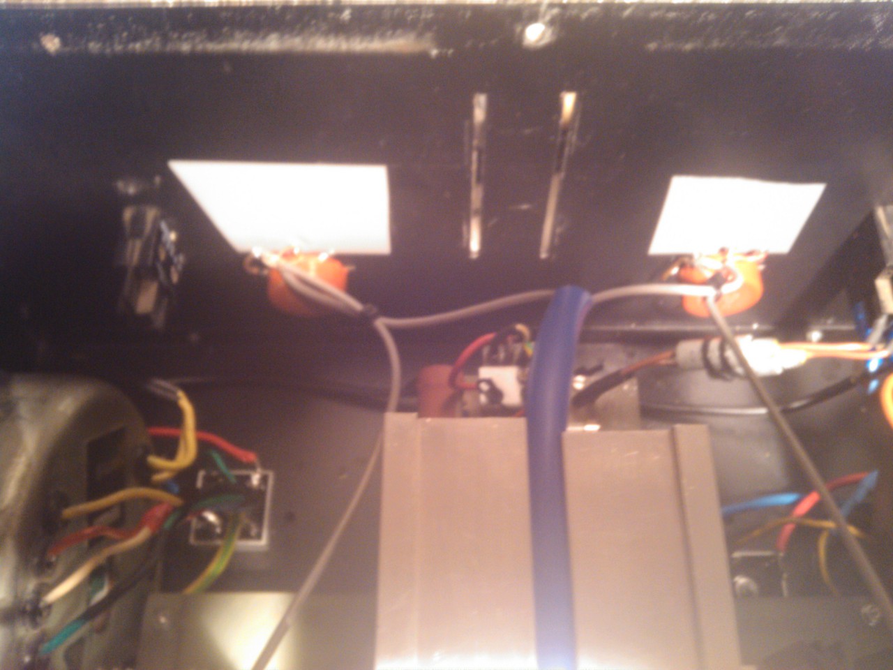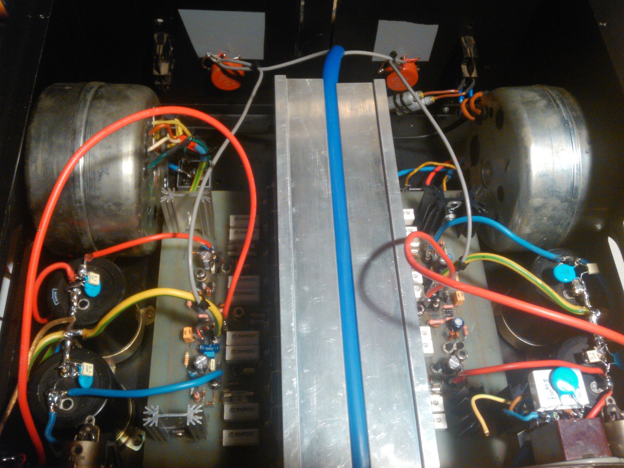 Sziasztok, ma szinte befejeztem a végfokot,sajna még koppgátlóm nincsen azt még csinálnom kell.A hosszú piros vezetékek azok a kimenetek,nem tudom hol lesz a védelem még benne ezért a próba erejéig hosszún hagytam őket.Kellett betennem lágy-indítót,mert csapdosta a 2db toroid a megszakítót.Nagyobb toroidok kellenének bele,de 204w igy is tud kimérve,a sinus töréséig.