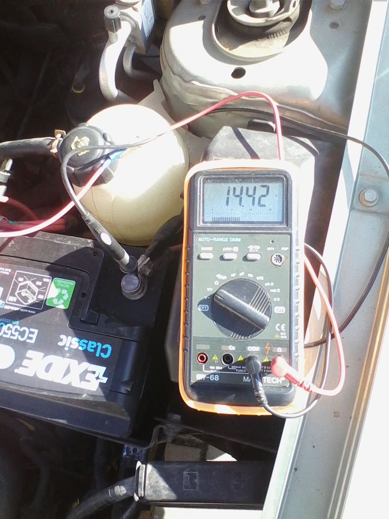 Ott áll előttem az udvaron, csak jár a motor, nem gyorsít. Ezekben túlnyomórészt szerintem nincs olyan számítógép, ami a feszt állítaná. Pl. a mi Opel Combónk is ilyen. Előtte ez is gyenge volt, vezeték kontakt hiba, meg lett csinálva, azóta 14,5-14,6V alapjáraton terhelés nélkül. Terhelve (fényszórók és ventilátor) lemegy 14,4V-ra.