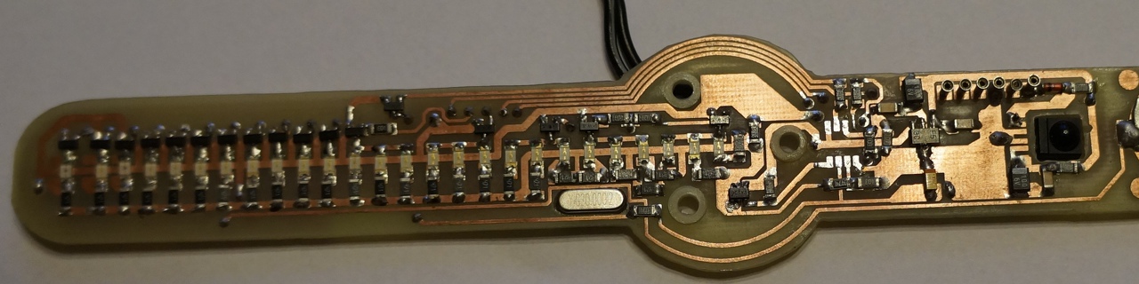 Processzor nélkül a ledmeghajtó tranzisztorok bázisa "lóg a levegőben" ezért világítanak.GND szintre húzva ki kell aludni,+5V-ra húzva világítani kell a led,ledcsoportoknak.Ha annyira felmelegszik a 7805 stabilizátor annak nyomós oka kell,hogy legyen mert a kontoller és az RTC fogyasztása nagyon kevés és a TSOP sem terheli le nagyon. Máshoz meg nem kell a ledek azok a főtápról vannak hajtva közvetlenül közbeiktatva egy P fet mely a fényerő állítást végzi a pozitív ágban.Tantálok nagyon kényesek a túlfeszültségre (jobb lenne bele elko de a súly és a méret miatt terveztem bele tantált és ha minden rendben van garantáltan évekig képes üzemelni meghibásodás nélkül akár a nap 24 órájában is).