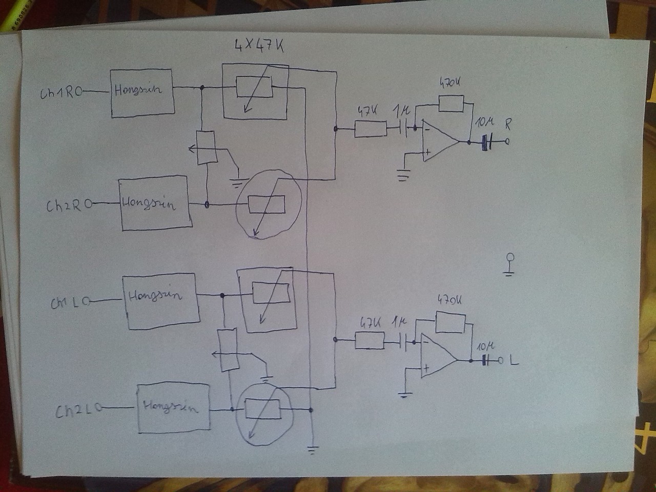 Sziasztok!Én egy keverőt szeretnék építeni. Szeretnék bele egy hangszínszabályzót, egy Crossfadert, meg ugye a tolópotis 1-2 csatorna hangerejének szabályzását.Ehhez szeretnék valami kapcsolási rajzot!Terveztem egyet, de nem vagyok benne biztos, hogy működne. A kapcsolást mellékeltem, működése a következő: a bemeneten hangszínszabályzás van Ch1R és Ch1L jelét egyszerre szabályoznám egy stereo potival, Ch2R és Ch2L jelét hasonlóan egy stereo potival. A következő fokozat egy Crossfader lenne. Ha jobbra húzom a stero potit, akkor CH1R és Ch1R jelét vezetné a földbe, ha balra húzom, akkor Ch1L és Ch2L jelét vezetné a földbe. A következő fokozat 4db tolópotiból áll ez 2db stereo poti, Ch1R és Ch1L egy potival lenne szabályozva, Ch2R és Ch2L szintén ugyanazon stereo potival lenne szabályozva. EZ után lenne 1-1 műveleti erősítő, mely erősítené Ch1R, Ch2R jelét, illetve egy másik műveleti erősítő Ch1L és Ch2L jelét erősíteni és így lenne a stereo kimenet.