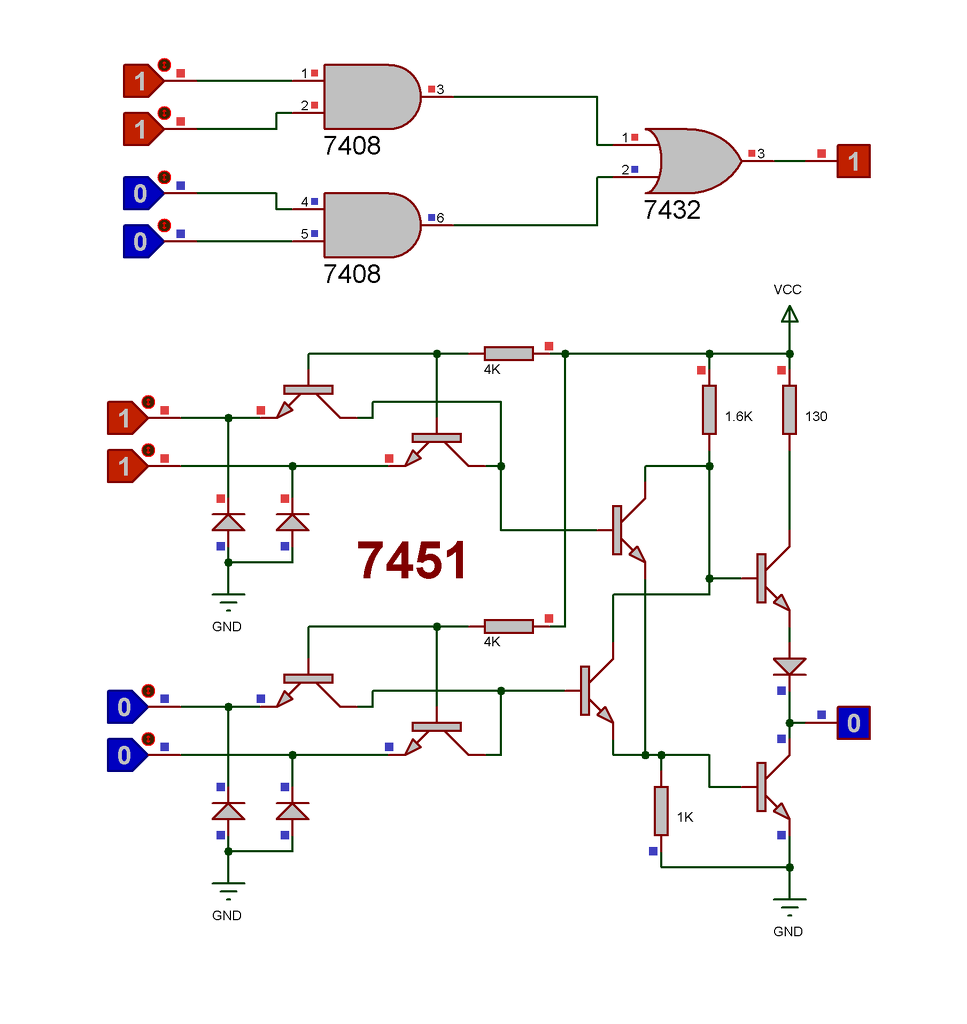 Mégsem ajánlom a megvalósítását. Egyrészt a megoldás nagyimpedanciás és emiatt lassú és zavarérzékeny. Egy TTL áramkörben 10ns átkapcsolási idők fordulnak elő. A feladatra fejelsztették ki a 74(LS)51 -et. Adatlap