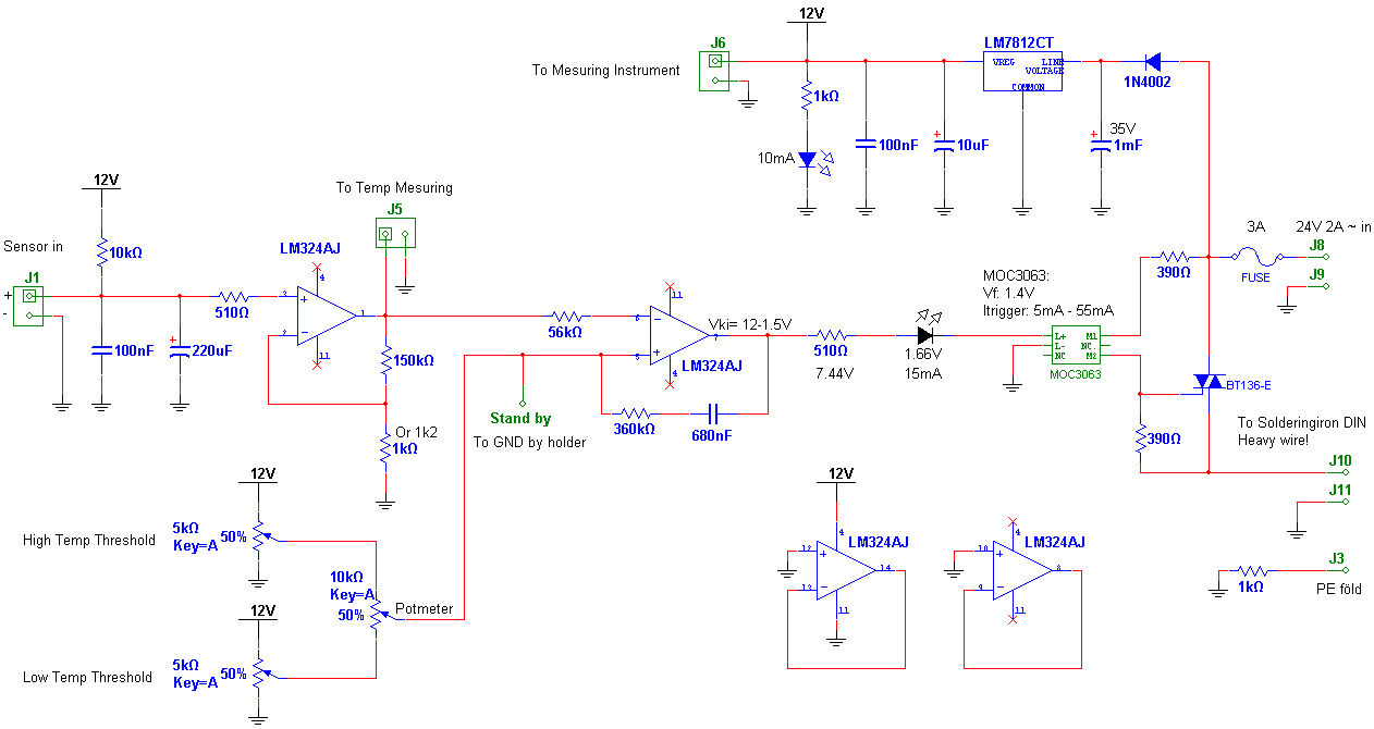 A minimális és maximális hőmérséklet-értéket beállító trimmerek így nehezebb beállíthatóságot okoznak. Konkrétan nem lehet azt mondani hogy EZ a trimmer a minimális hőmérséklet beállítására való, EZ pedig a maximálisra. Mivel akár fordítva is működhetnek. Ezért jobb a két trimmert sorba kötni, ezáltal lehetetlen az egyiket 'a másikon át tekerni'. Ezen felül a trimmerek 5k-sak, a 'belűlük táplálkozó' poti pedig 10k. Nagyobb differencia kellene köztük, hogy a trimmerekkel beállított értékbe a poti ne annyira tudjon beleszólni. A műveleti erősítőt látom leegyszerűsítetted. Úgy emlékszem halványan, hogy ilyesmivel én is próbálkoztam, de nem volt annyira jó. Te ezt kipróbáltad már? Működik rendesen? A komparátornál a pozitív visszacsatolásnak nem látom értelmét sőt, inkább csak ront az áramkörön. Nem oszcillátort akarunk építeni. Ha van is visszacsatolás, akkor az inkább negatív legyen. A hőelemről jövő jelet én nem pufferelném közvetlen. Egy ellenállással le kellene választani, de így is biztos jó. Az, hogy a maradék műv. erősítőket bekötötted a gnd feszültség-követőjének mindenképpen jó.