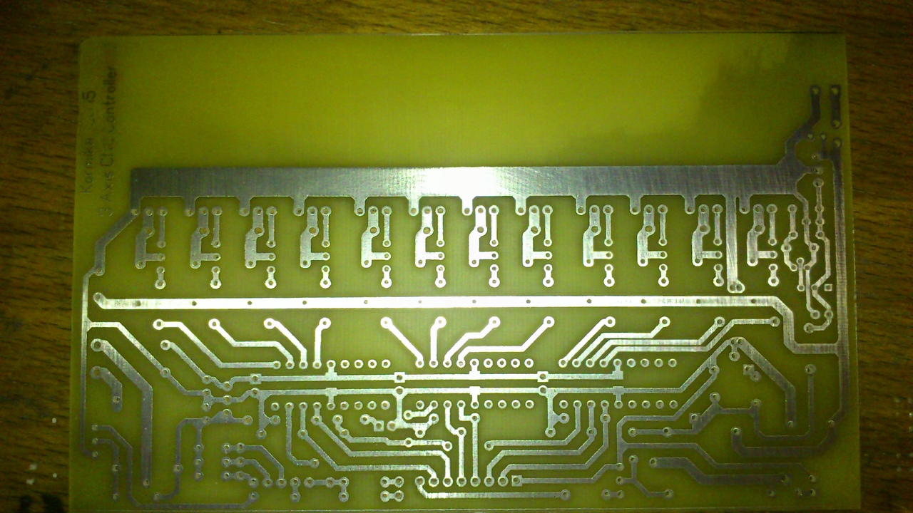 Sziasztok! Kezd alakot ölteni a saját tervezésű CNC vezérlőm... 3 tengelyes, unipoláris léptetőmotorokhoz, párhuzamos porton keresztül kapja a vezérlőjeleket, Step/Dir rendszerű, a jelenlegi kiépítésben motoronként 3A a maximális áram, és 35V a max. tápfesz. A hűtőborda hőfokát egy NTC figyeli, 40°C-nál elindítja a ventit, és ahogy melegszik, úgy adja neki egyre jobban a kakót, 60°C-nál kapja meg a venti a teljes tápfeszt. A 3 üres foglalatba majd 3 db 16F818-as PIC kerül, azok még egyelőre nincsenek bent, még be kell fejeznem a programot, és fel kell őket programozni. Ha bekerült a dobozába akkor majd teszek fel még képeket, a próbáról pedig majd videót. A panel vasalással készült, 145x90mm-es.