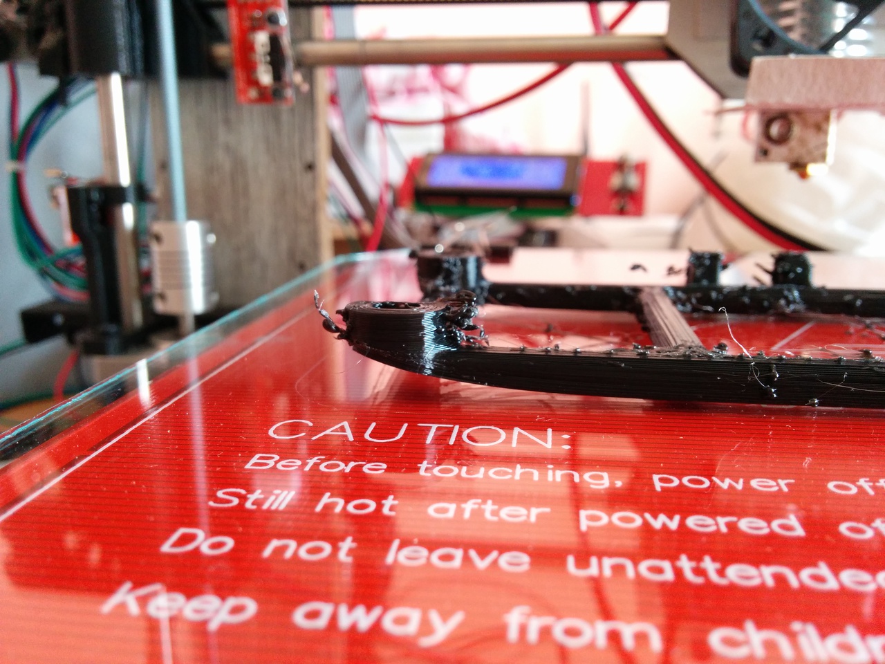 Így elveszik némi felület a 20x20cm-hez képest, de ez még nem okozott gondot, pedig nagy kiterjedésû dolgokat is nyomtatok. Herz 3mm PLA, 190 fokon, zöld/fekete/fehér is. Az elsô réteget belenyomom az üvegbe eléggé, tehát szétlapul az üvegen (szinte alig jön ki az anyag). Amikor a két kört "rajzolja" nyomat elôtt, beállítom a magasságot kézzel (menetes-szárat forgatom, ez Prusa esetén macerás lenne, de nálam csak egy tengely van). Nyomtatás elôtt közevetlen kinyomok manuálban anyagot, hogy amikor már nyomtat, biztosan jöjjön. A hozzászólás módosítva: Feb 17, 2015