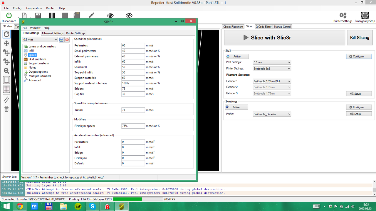 Illetve minden sebességet beállítottam a Dávidéhoz megfelelően, kivéve a travel speed-et, azt 180-ra állítottam. Az így nyomtatott objektum minősége jobb lett, de még mindig nem a legjobb. Referenciának a Dávid által nyomtatott alkatrészeket használom.